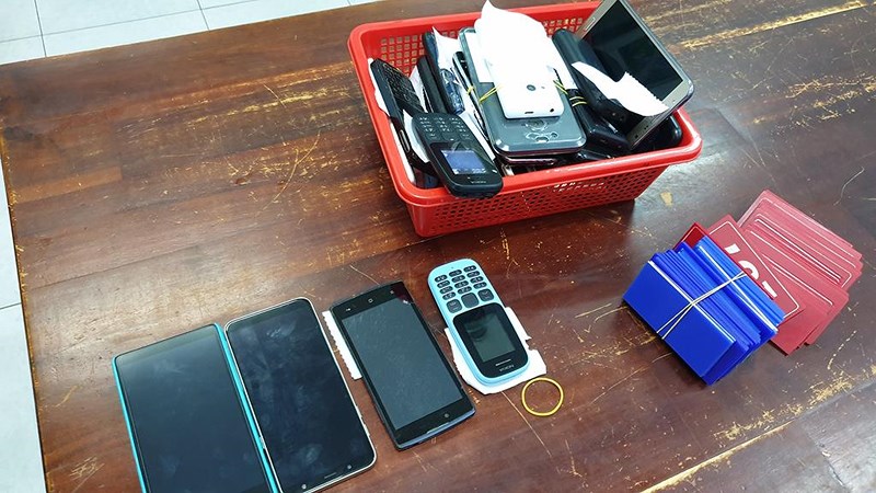 Tang vật thu giữ gồm nhiều điện thoại và thẻ nhựa để còn bạc đặt cược. (Ảnh: PLO)