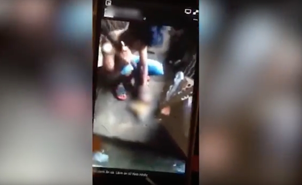 T.A. dùng dao chặt mạnh vào đầu chú chó. Ảnh cắt từ clip.