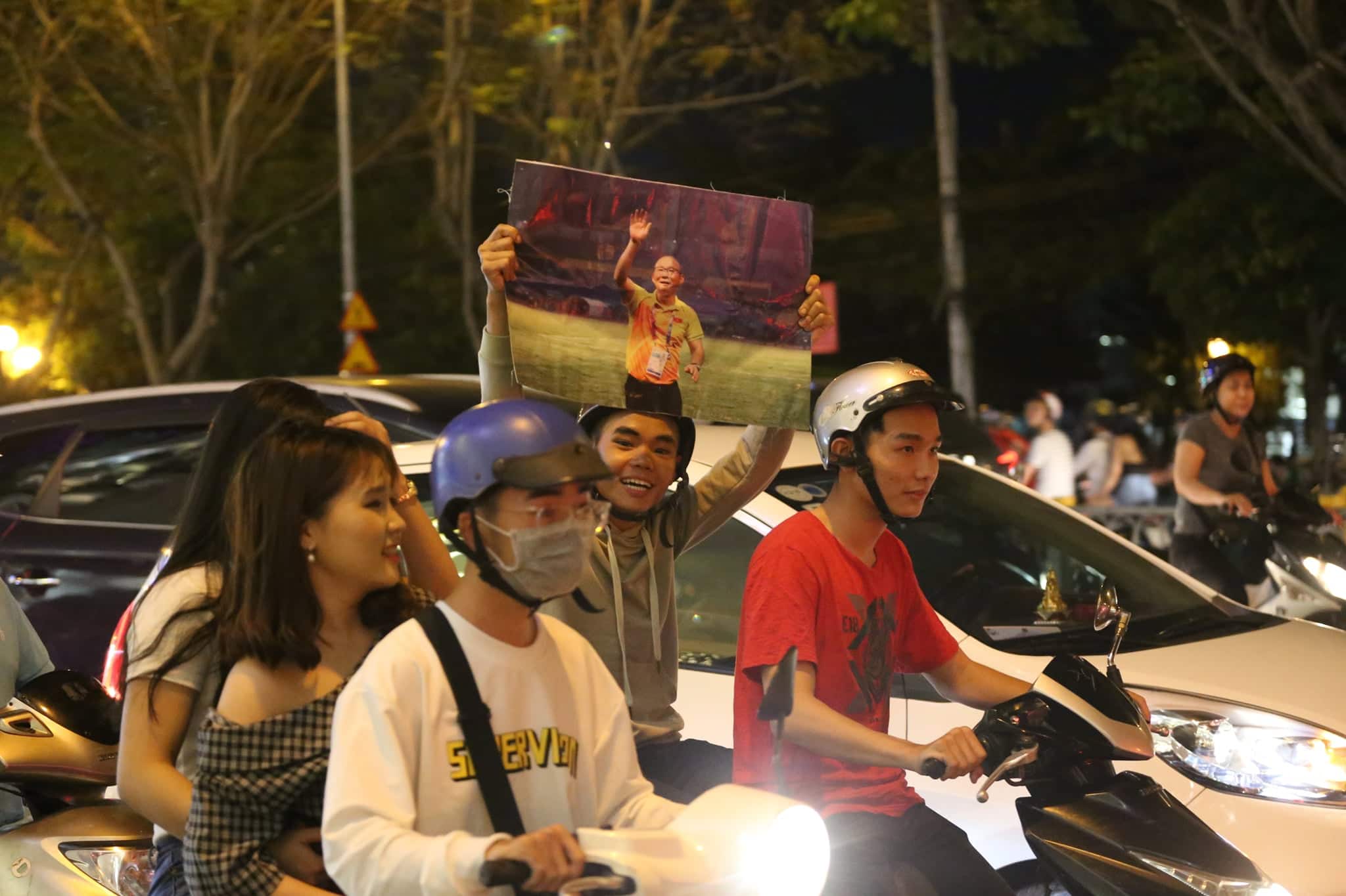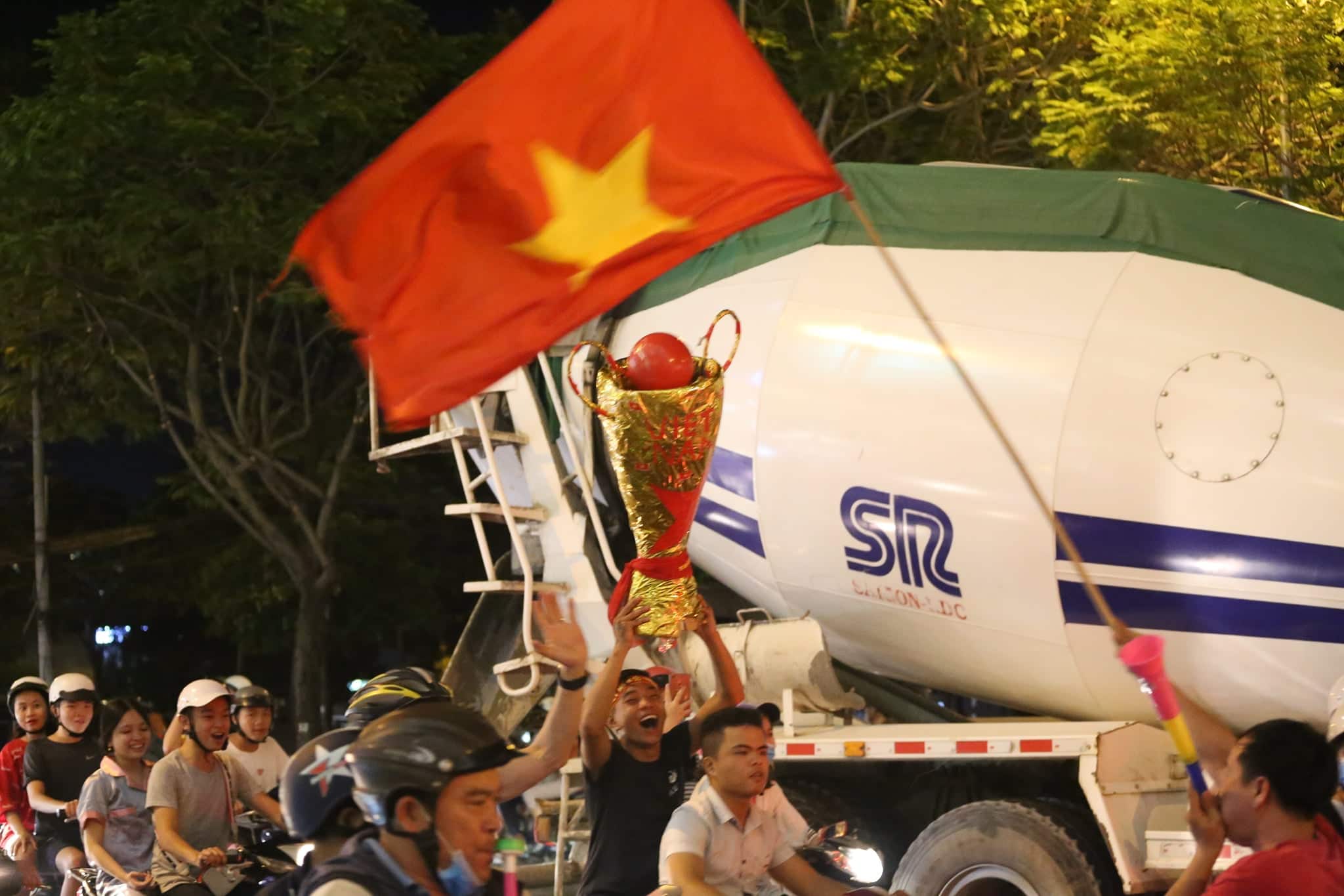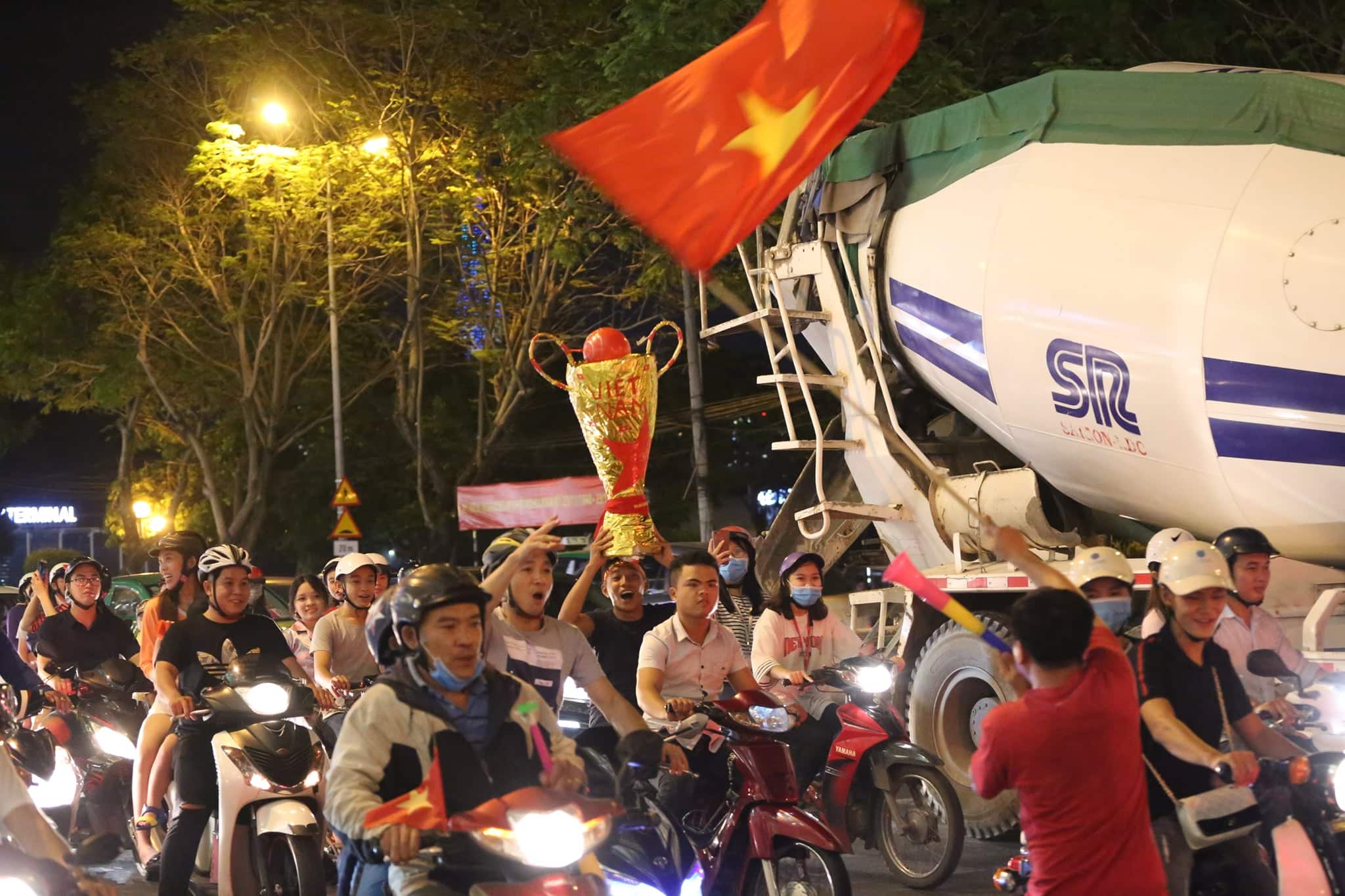 Đoàn người kéo nhau diễu hành sau chiến thắng của tuyển Việt Nam.