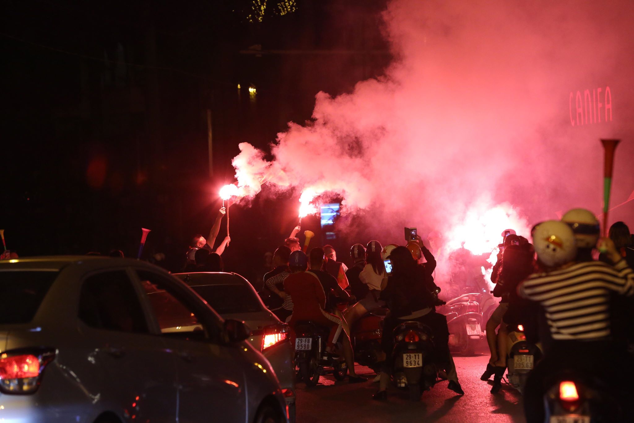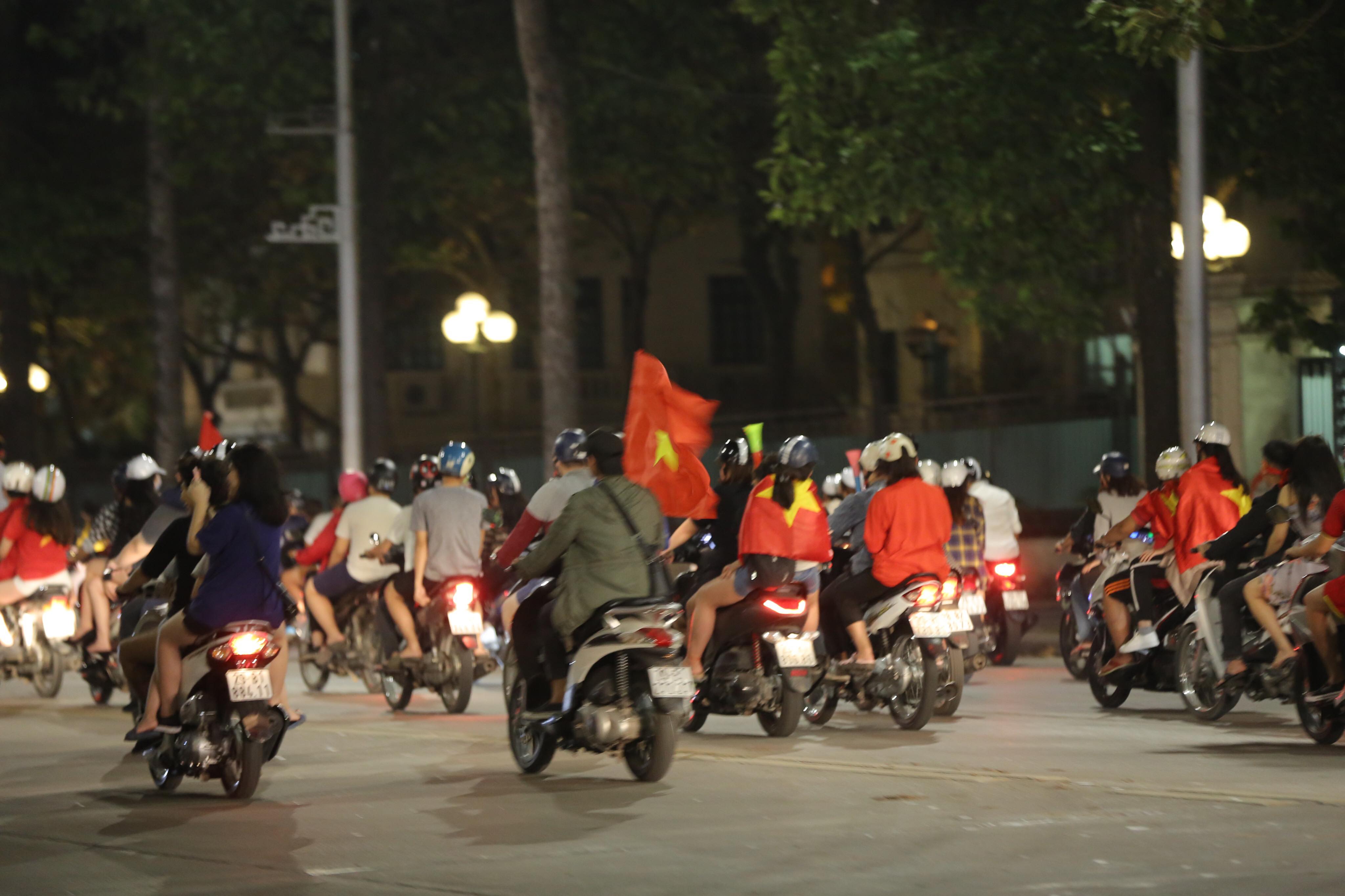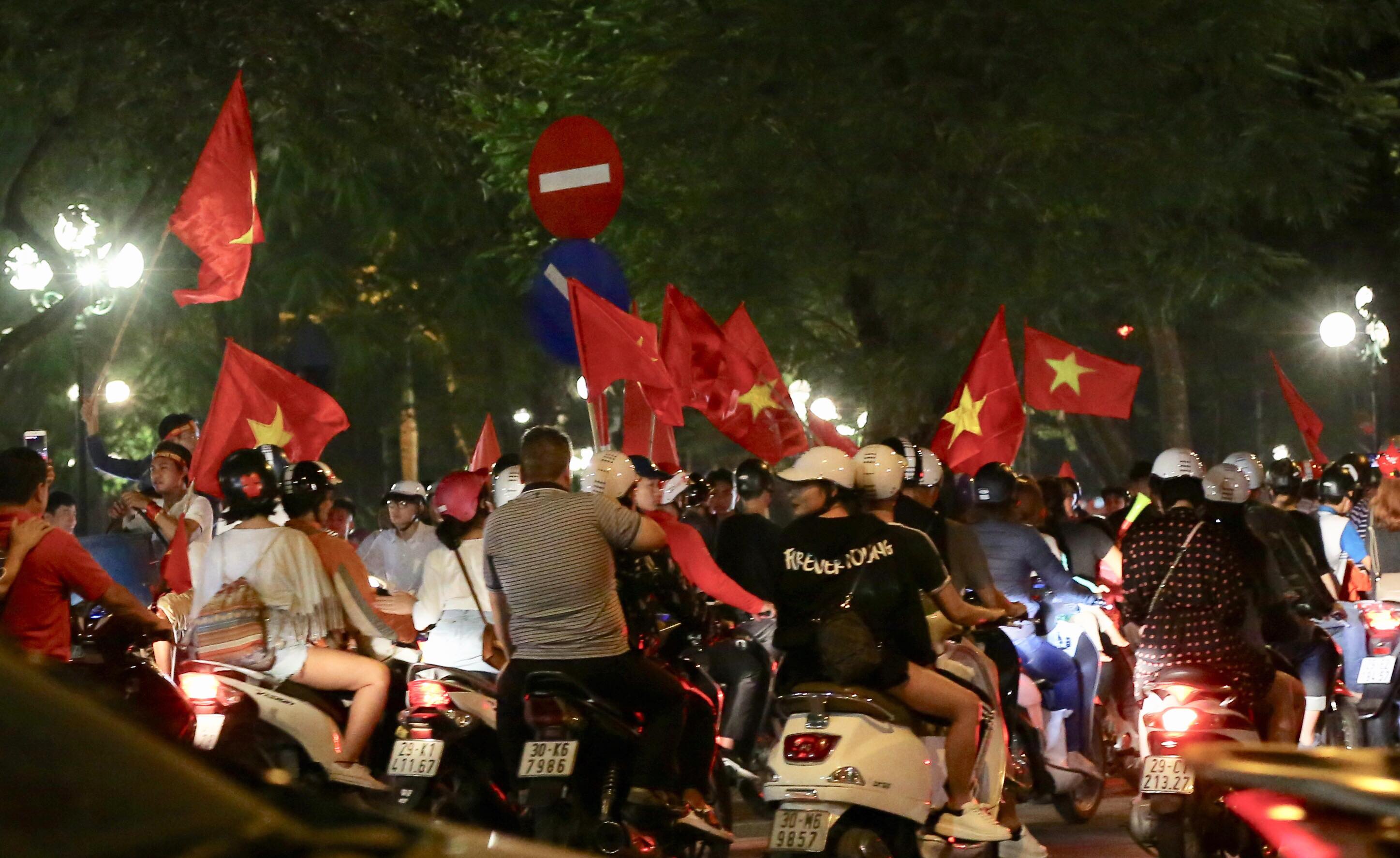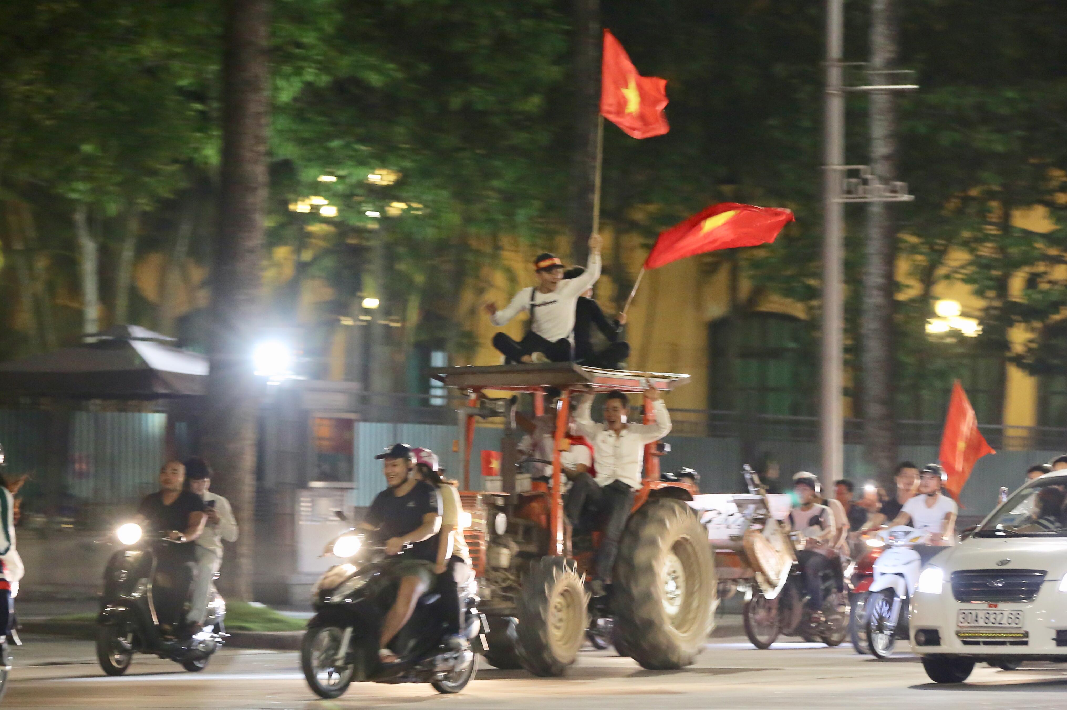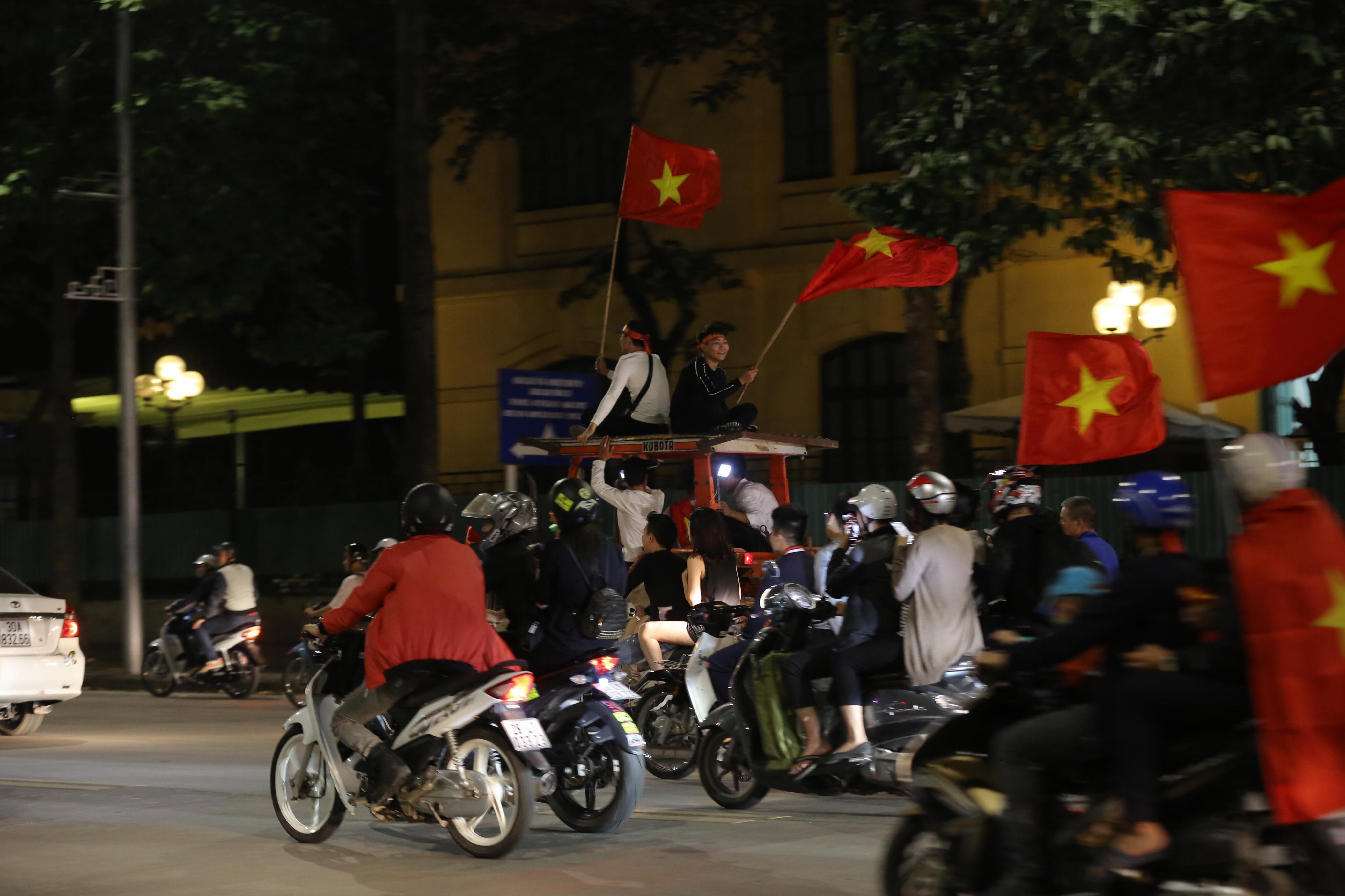 Tại Hà Nội, hàng trăm cổ động viên cùng cờ đỏ sao vàng, trống kèn, băng rôn… diễu hành quanh Lăng Bác, đường Thanh Niên, đường Phan Đình Phùng… cùng ăn mừng chiến thắng của đội tuyển Việt Nam: