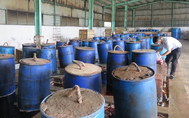 Tại thời điểm tra, cơ sở đang thực hiện ngâm ớt bằng nước muối trong các bể chứa được xây dựng bằng xi măng và được nén bằng các thùng phi.