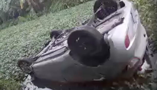 Hình ảnh chiếc xe lật ngửa dưới ao, bên trong có 1 nam thanh niên đã tử vong. Ảnh cắt từ clip.