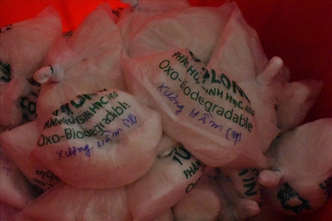 Những gói gia vị có màu vàng lợt được đóng trong các túi ni lông nhỏ và được ghi là “xương hầm”. Ảnh: báo Lao Động.