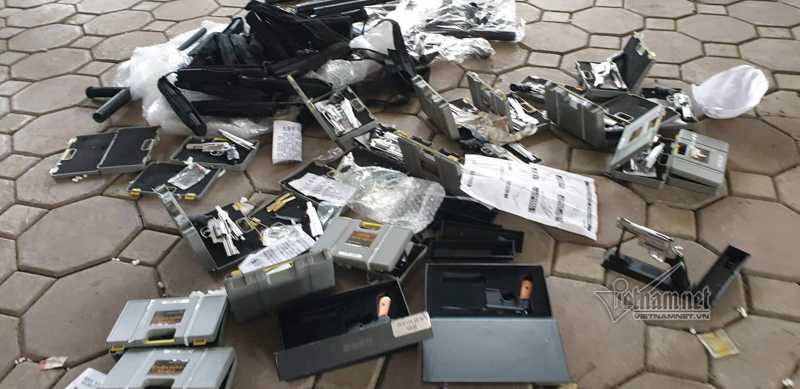 Qua kiểm tra, CSGT phát hiện người phụ nữ chở theo trên xe có 19 khẩu súng tự chế kèm đạn kim loại, ống giảm thanh cùng các công cụ hổ trợ gồm hàng chục dùi cui, baton, gậy 3 khúc…Tất cả số hàng trên không giấy tờ chứng minh nguồn gốc, xuất xứ, dán nhãn in chữ nước ngoài.