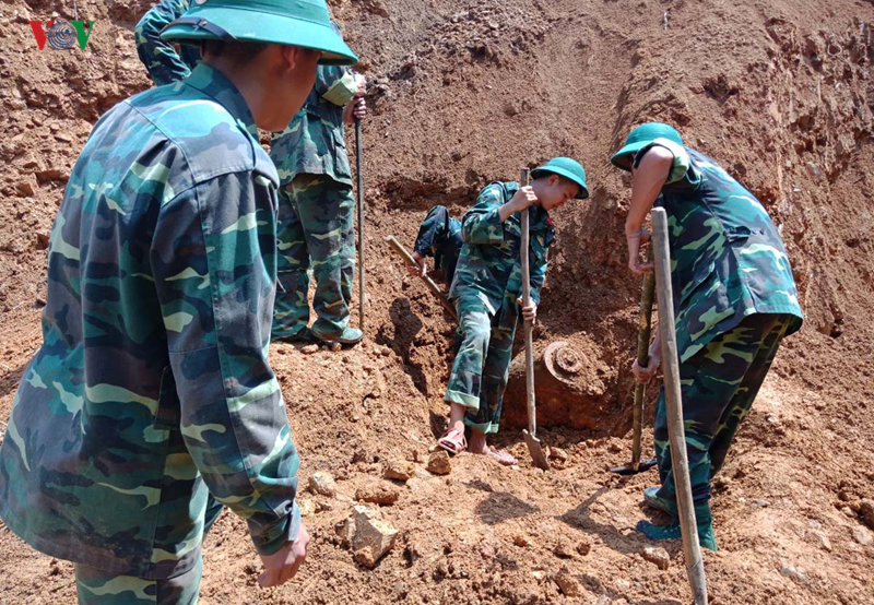 Lực lượng công binh tiến hành đào bới để vận chuyển quả bom đến nơi an toàn. Ảnh: báo VOV