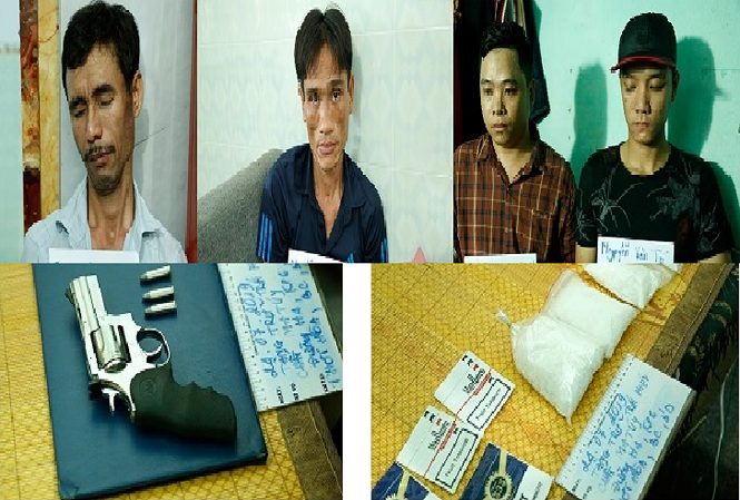 Nhóm đối tượng cùng súng, đạn và ma túy. (Ảnh: Tiền Phong).
