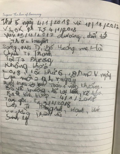 Những nét chữ còn nguệch ngoạc trong sổ nhật ký của anh Hải. Ảnh: Nam Phương.