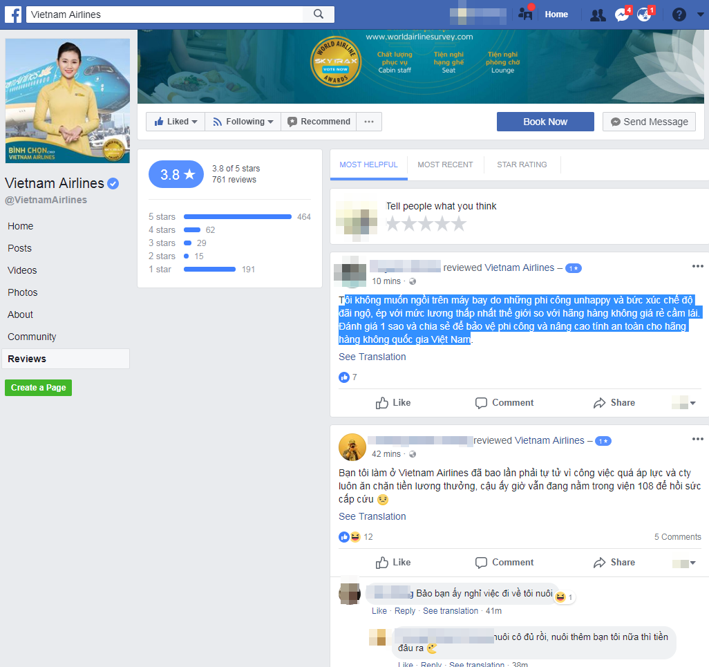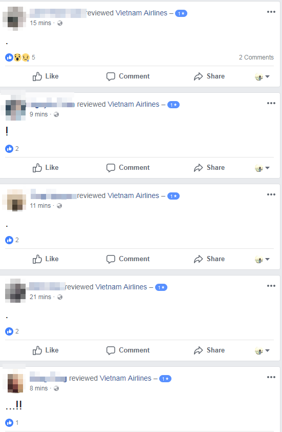 Fanpage chính thức của hãng hàng không Quốc gia Vietnam Airlines liên tục bị khách hàng đánh giá 1 sao