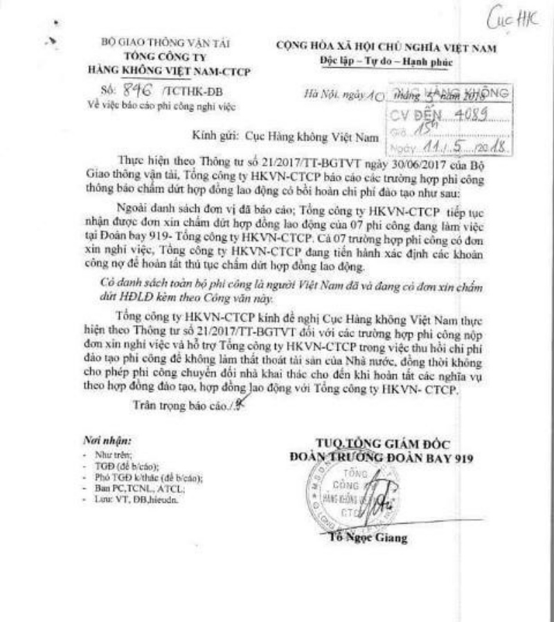 Tổng Công ty hàng không Việt Nam báo cáo việc phi công nghỉ việc và đề nghị Cục Hàng không Việt Nam hỗ trợ thu hồi chi phí đào tạo phi công.