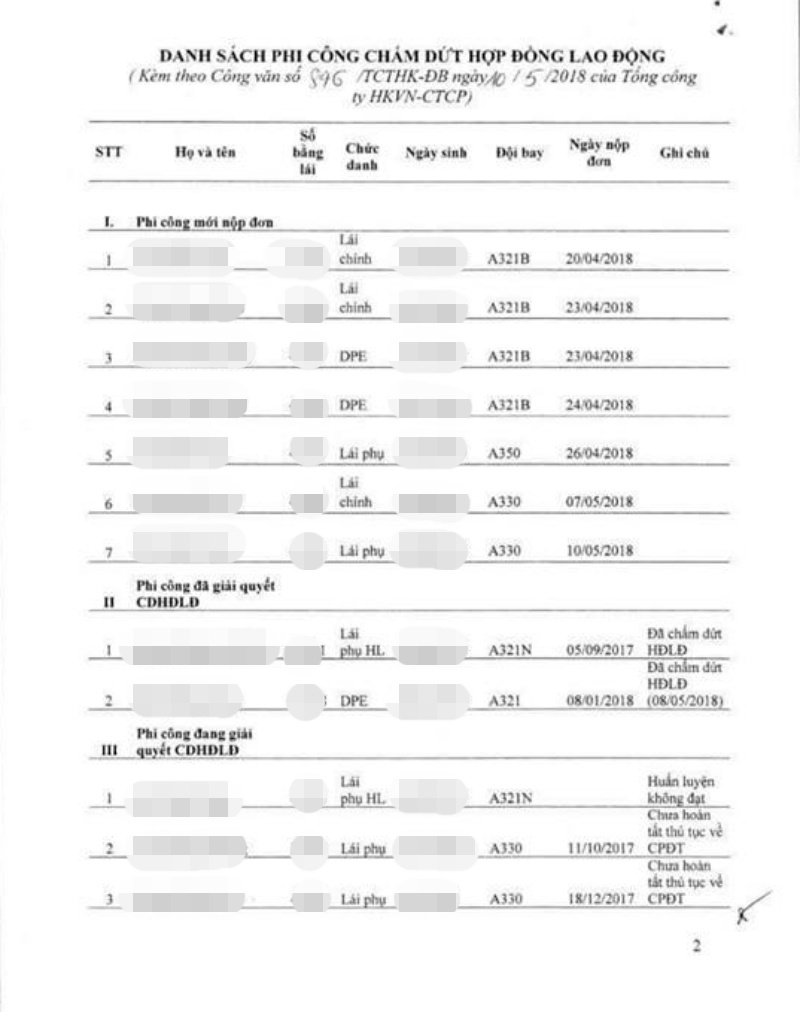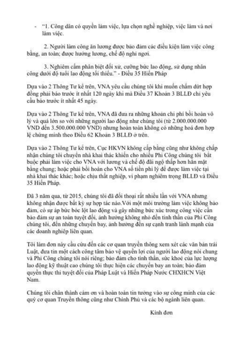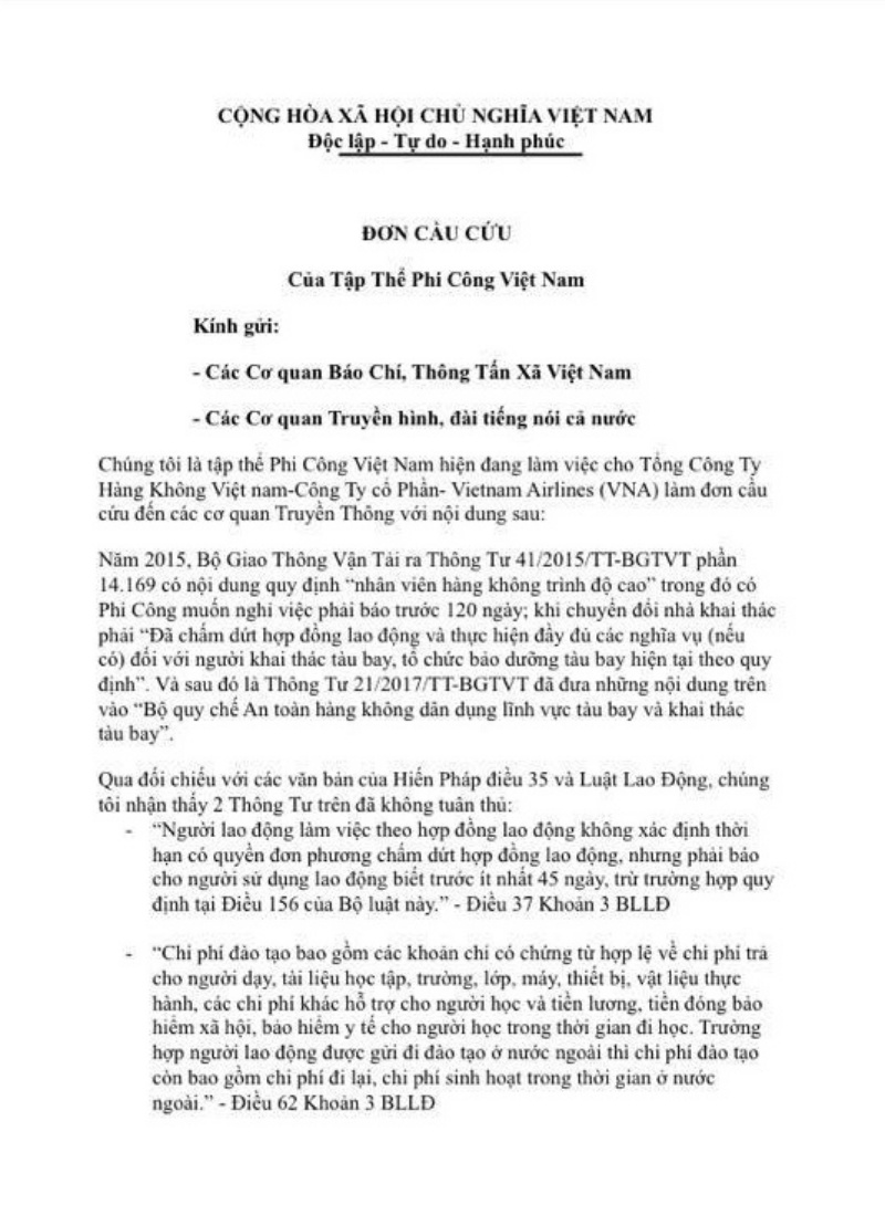 Đơn phản ánh của tập thể phi công đang công tác tại Tổng Công ty Hàng Không Việt Nam (Vietnam Airlines).