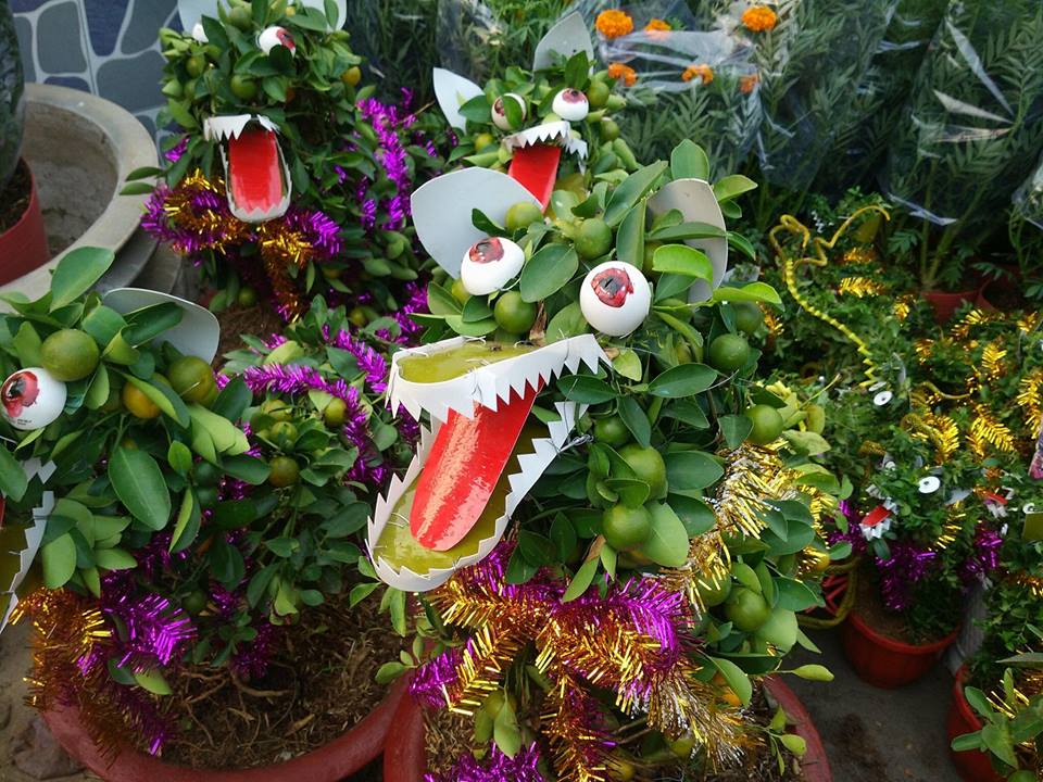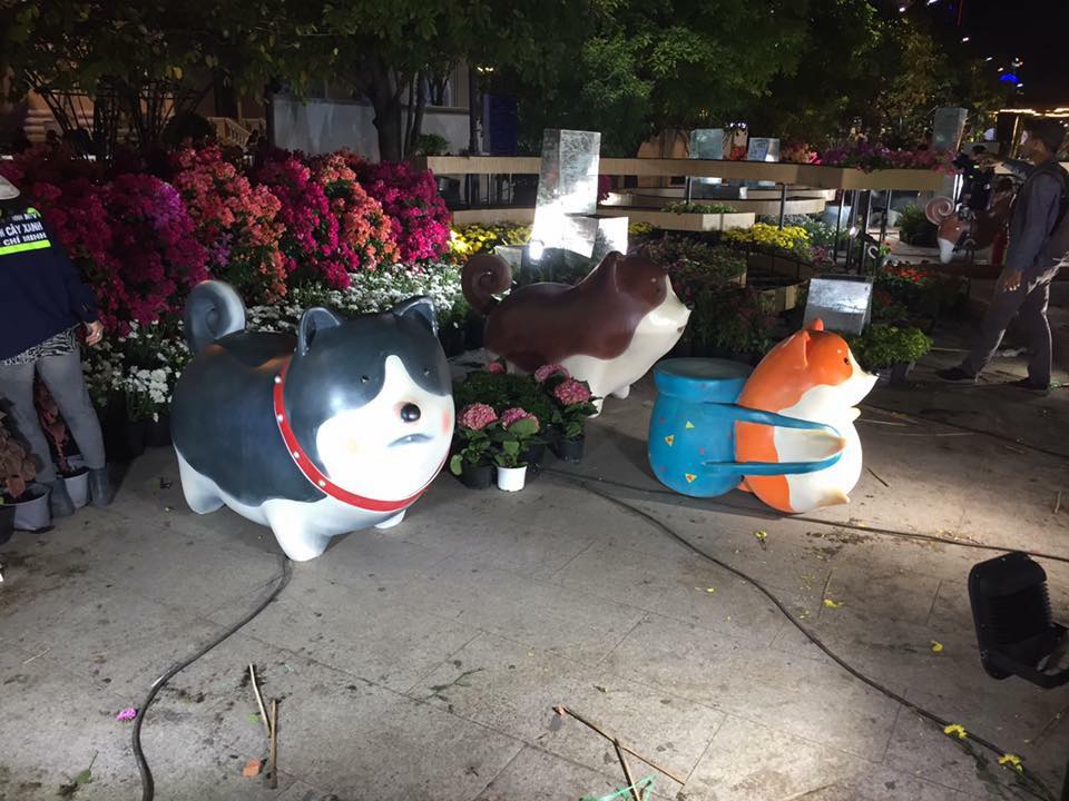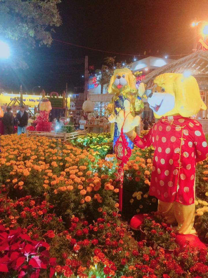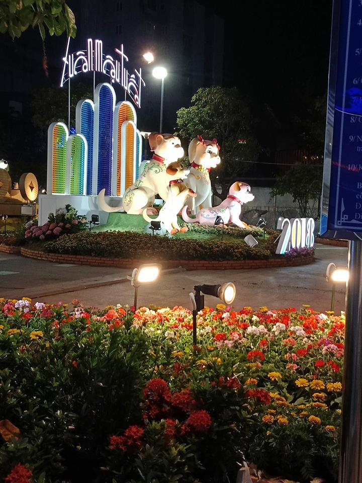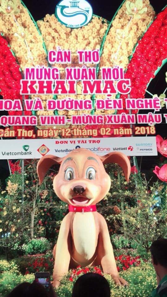 Tết năm con cún nên đi đến đâu cũng thấy các mô hình này xuất hiện. Ngay dưới dải hoa là hình ảnh các chú chó cao lớn khổng lồ. Từ đường hoa Nguyễn Huệ (Sài Gòn) cho đến Bạc Liêu, Cần Thơ, Cam Ranh đều có những chú chó đáng yêu đứng gác. Con nào con nấy đều có vẻ mặt đáng yêu, được trang trí thêm nhiều loại hoa văn sặc sỡ nhìn hết sức ngộ nghĩnh, đáng yêu muốn xỉu.