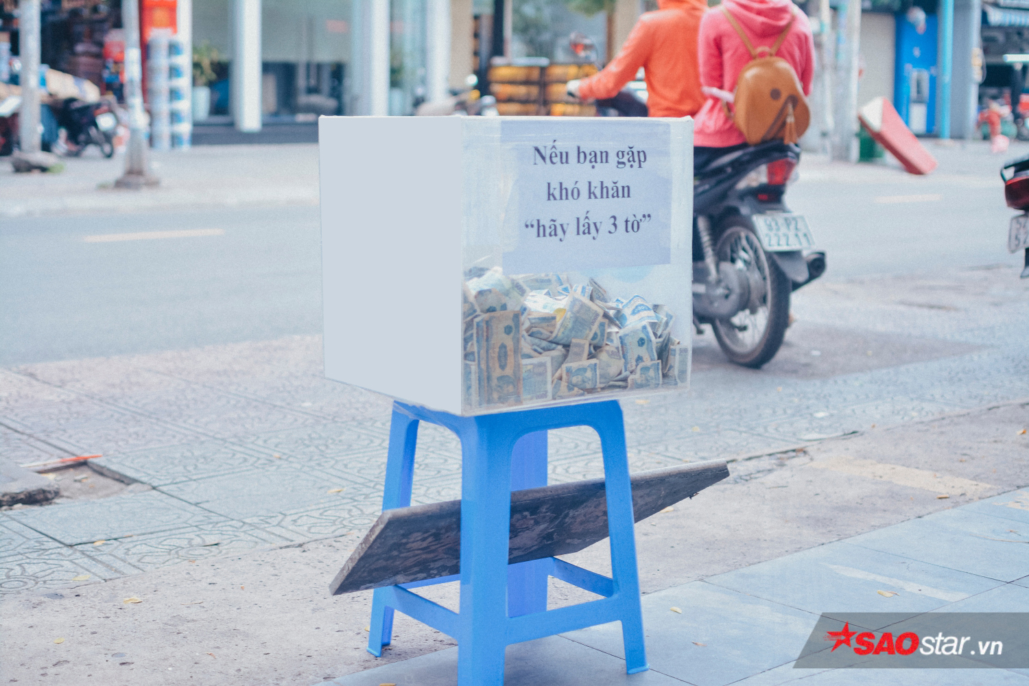 Hỏi tại sao chọn mệnh giá 5 nghìn đồng, chị Diệp cười: “Bởi theo chị, 3 tờ 5 nghìn là được 15 nghìn, một mức sống tối thiểu nhất để một người có thể duy trì ở Sài Gòn. Vì nó bằng hai suất cơm chay cho hai buổi sáng-chiều. Mỗi người lấy một lần trong ngày và có thể quay lại vào hôm sau để tiếp tục”.