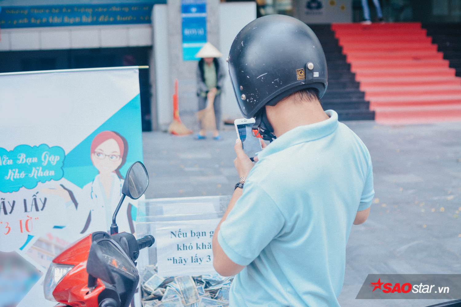 Một lúc khác, có anh văn phòng đi ngang qua, bỏ vào thùng 5 nghìn. Tôi hỏi thì anh trả lời: Ăn cơm trưa 15 nghìn, họ thối 5 nghìn nên đem ra quyên góp. Lúc sau, lại có chú đi xe đạp chạy vào bỏ thêm 20 nghìn. Hỏi thì chú giải thích: Vì chú từng không có một đồng xu để sống ở Sài Gòn, từng nếm cảm giác cơm không có ăn, nước không có uống như thế nào. Vì vậy, cứ có bao nhiêu tiền dư giả xíu là chú sẽ góp thêm cho thùng tiền”.