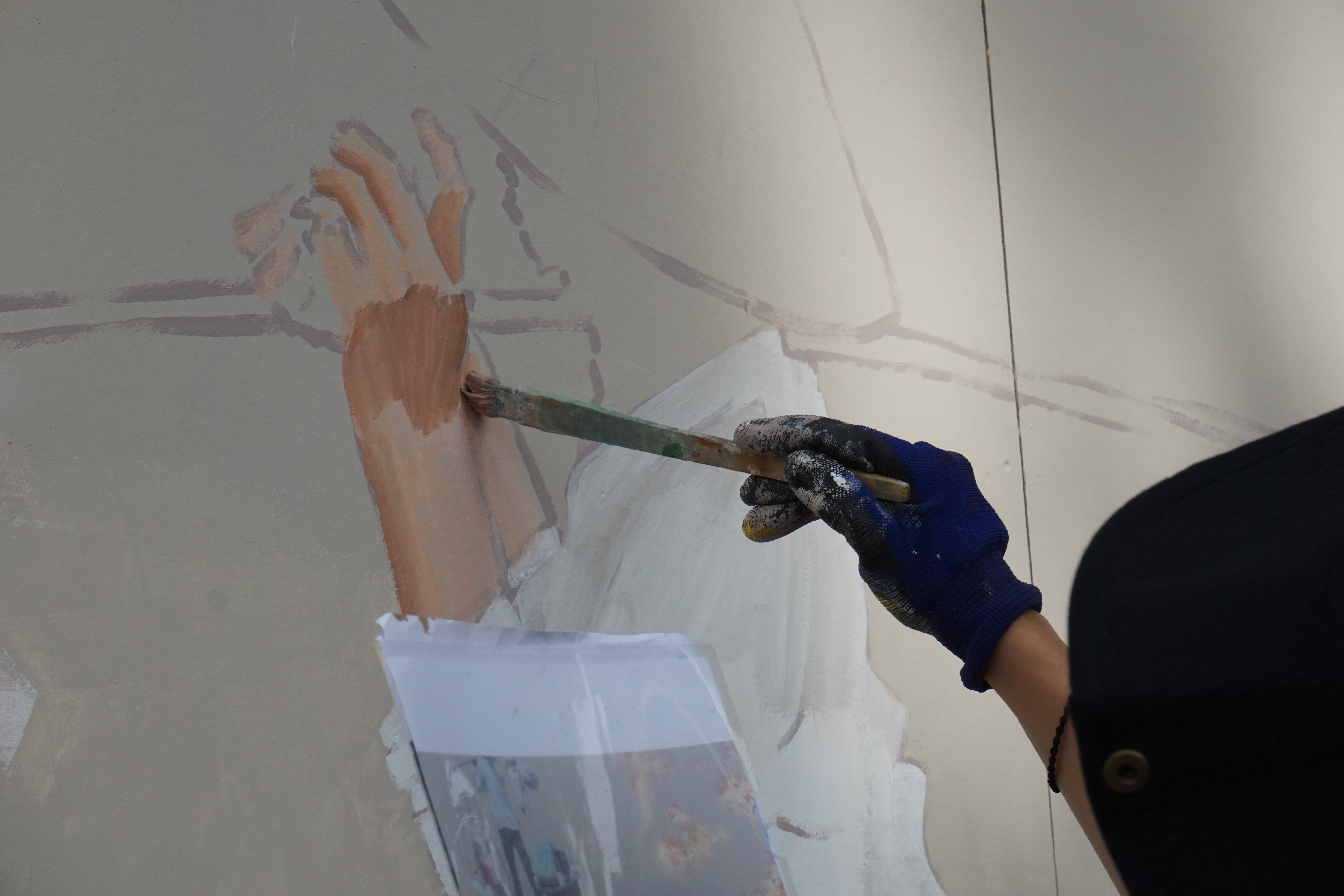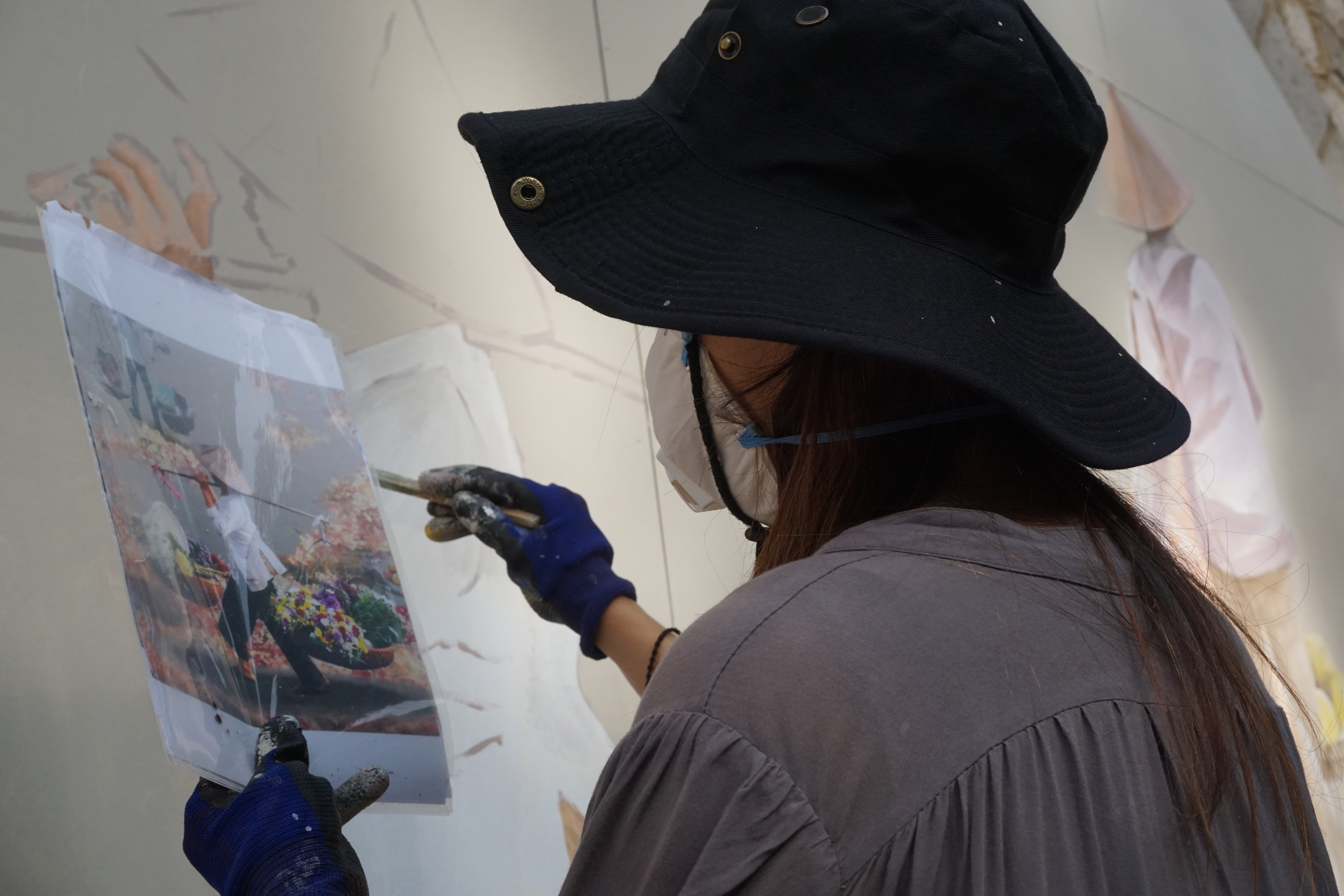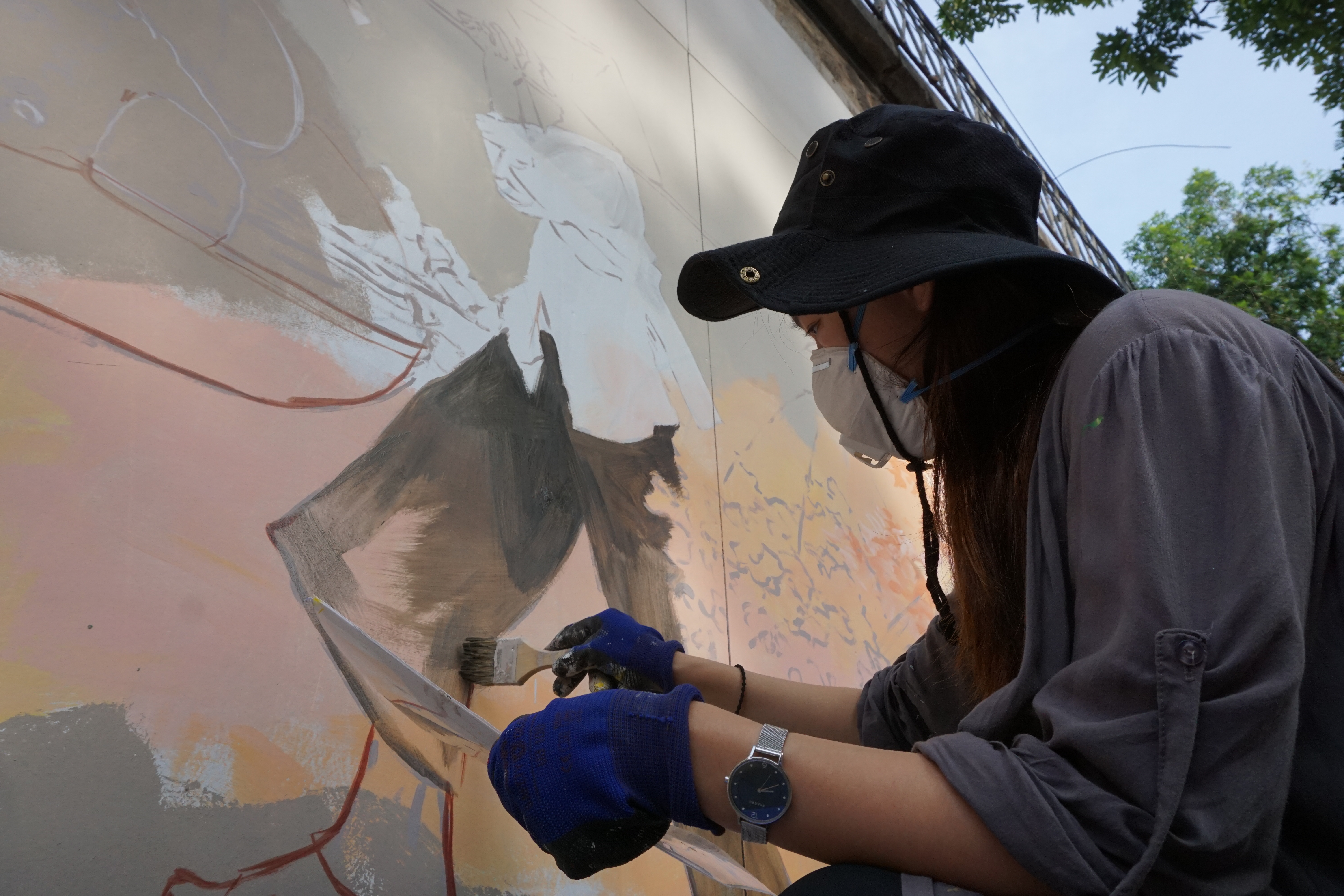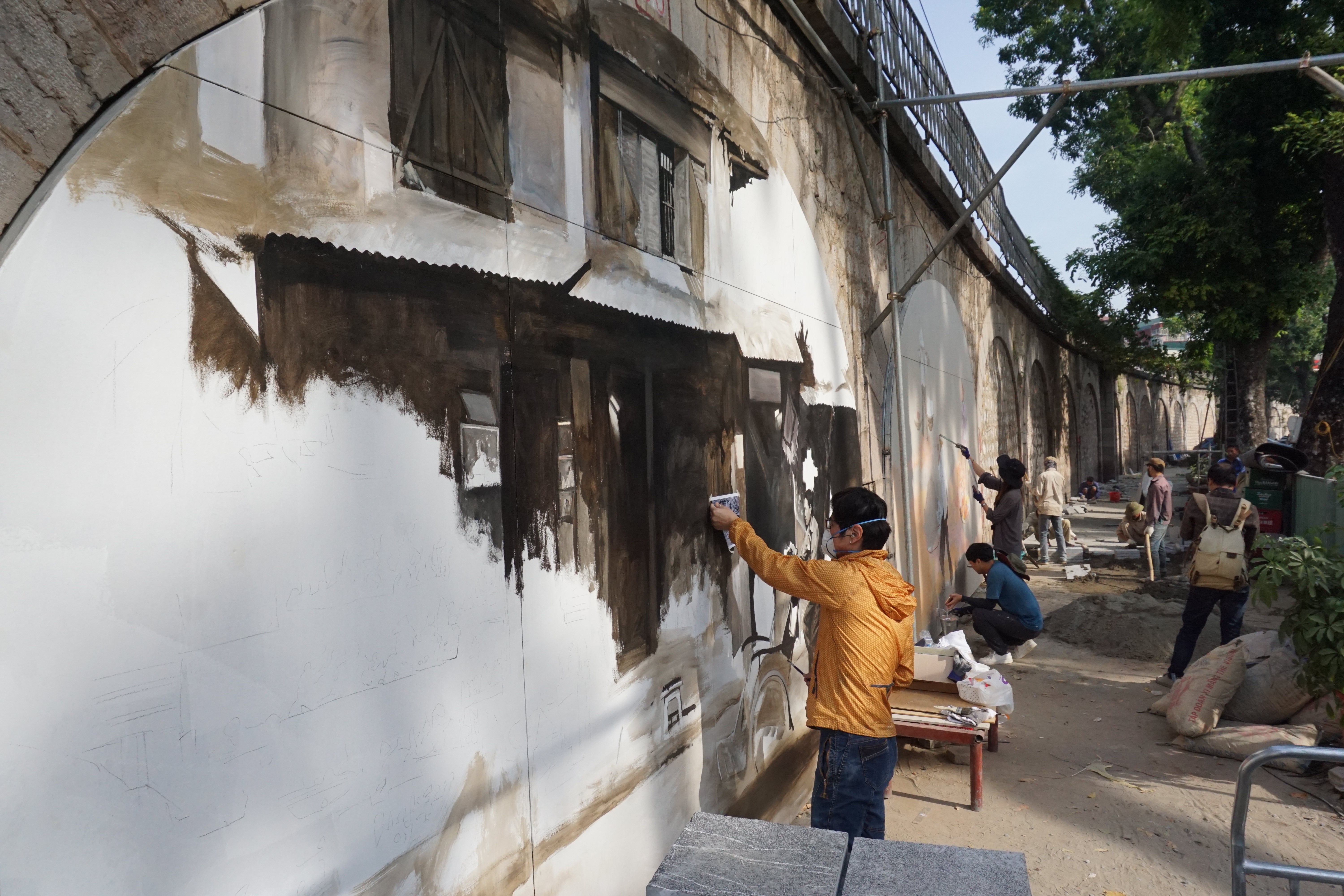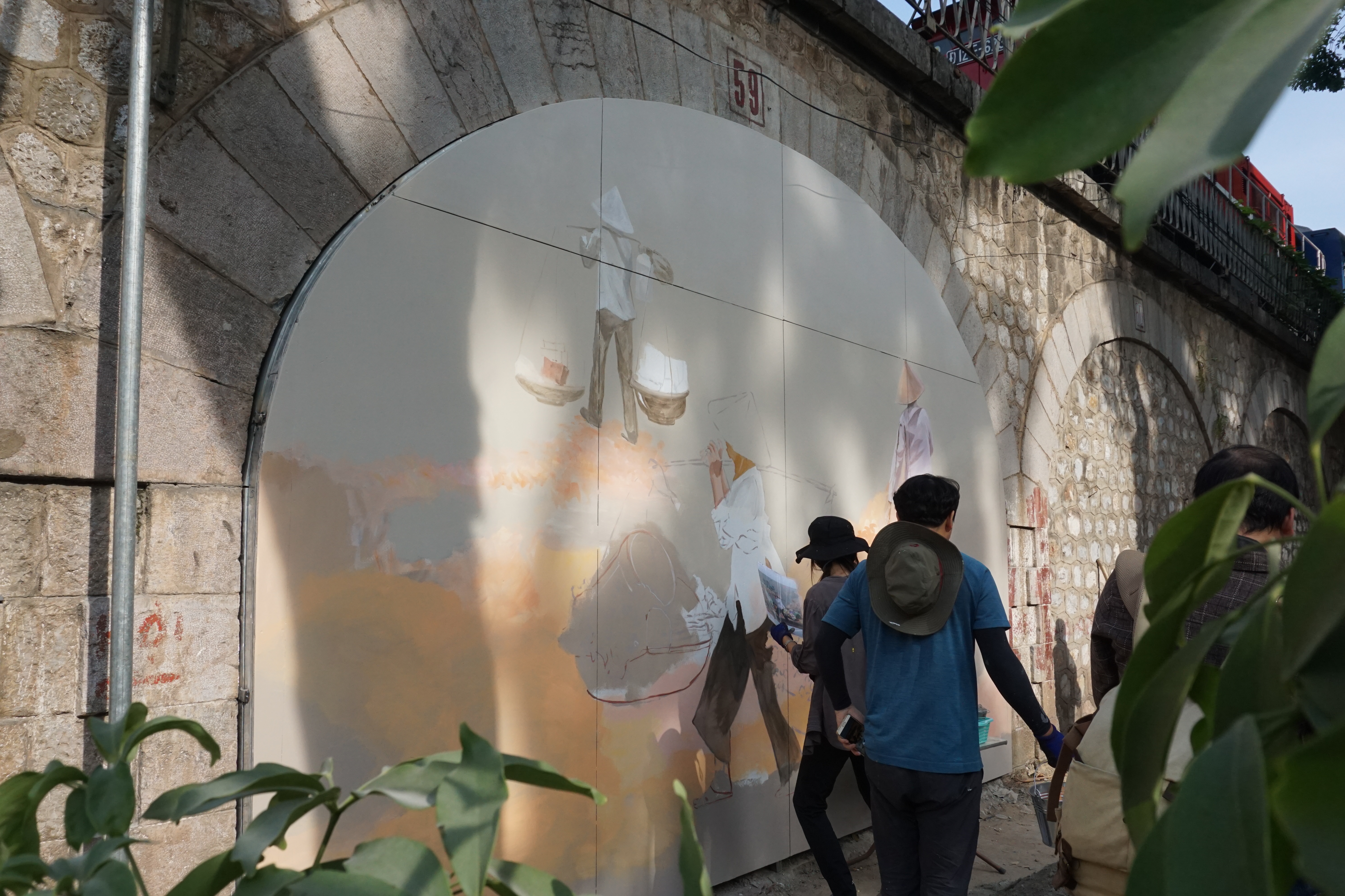 Đây là dự án do UN-Habitat phối hợp với Quỹ giao lưu quốc tế Hàn Quốc và UBND quận Hoàn Kiếm tổ chức. Địa điểm triển khai là mặt vòm phía đông phố Phùng Hưng (đoạn từ ngã ba Phùng Hưng - Lê Văn Linh đến phố Hàng Cót). Ảnh: Những bức bích họa dần hình thành.
