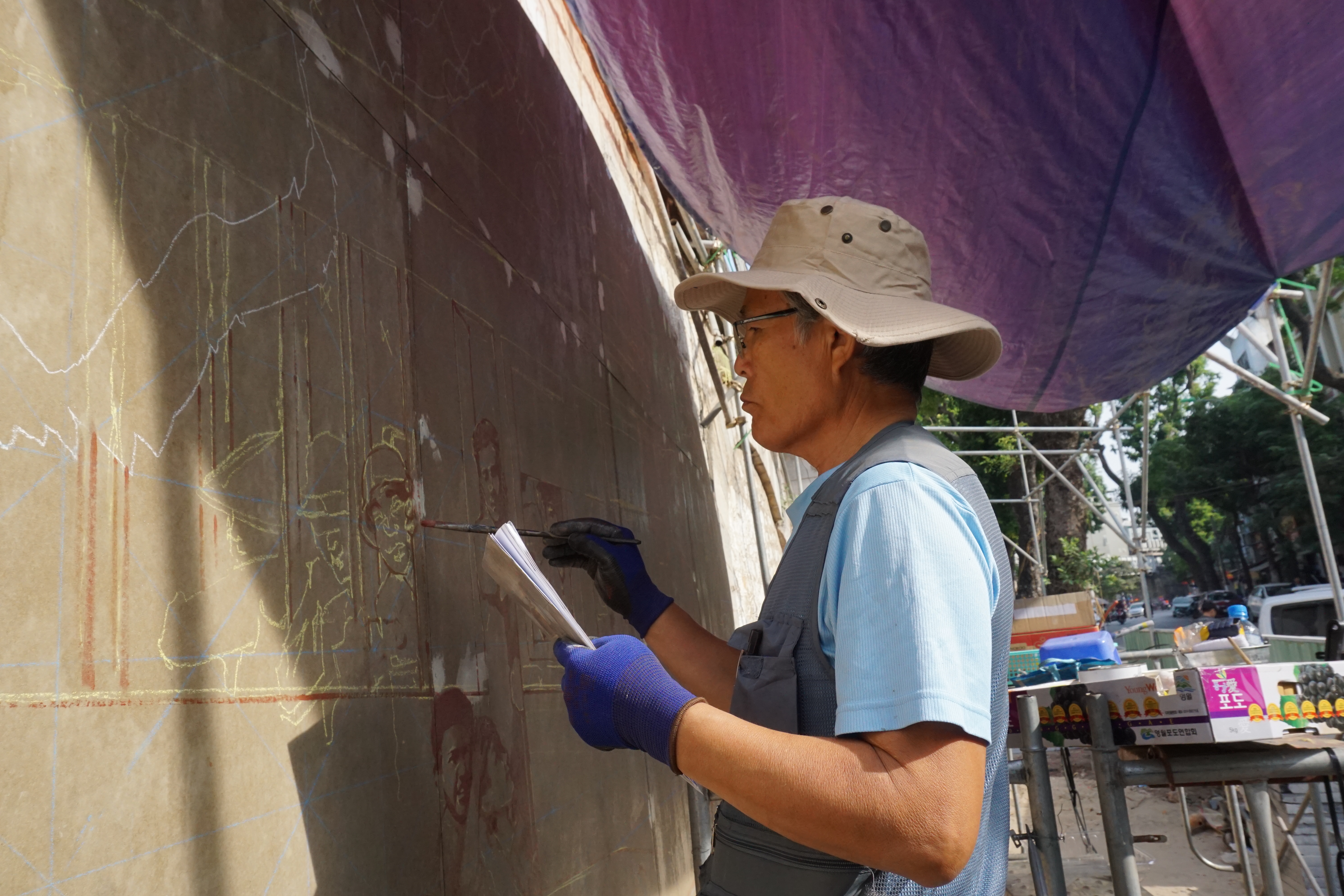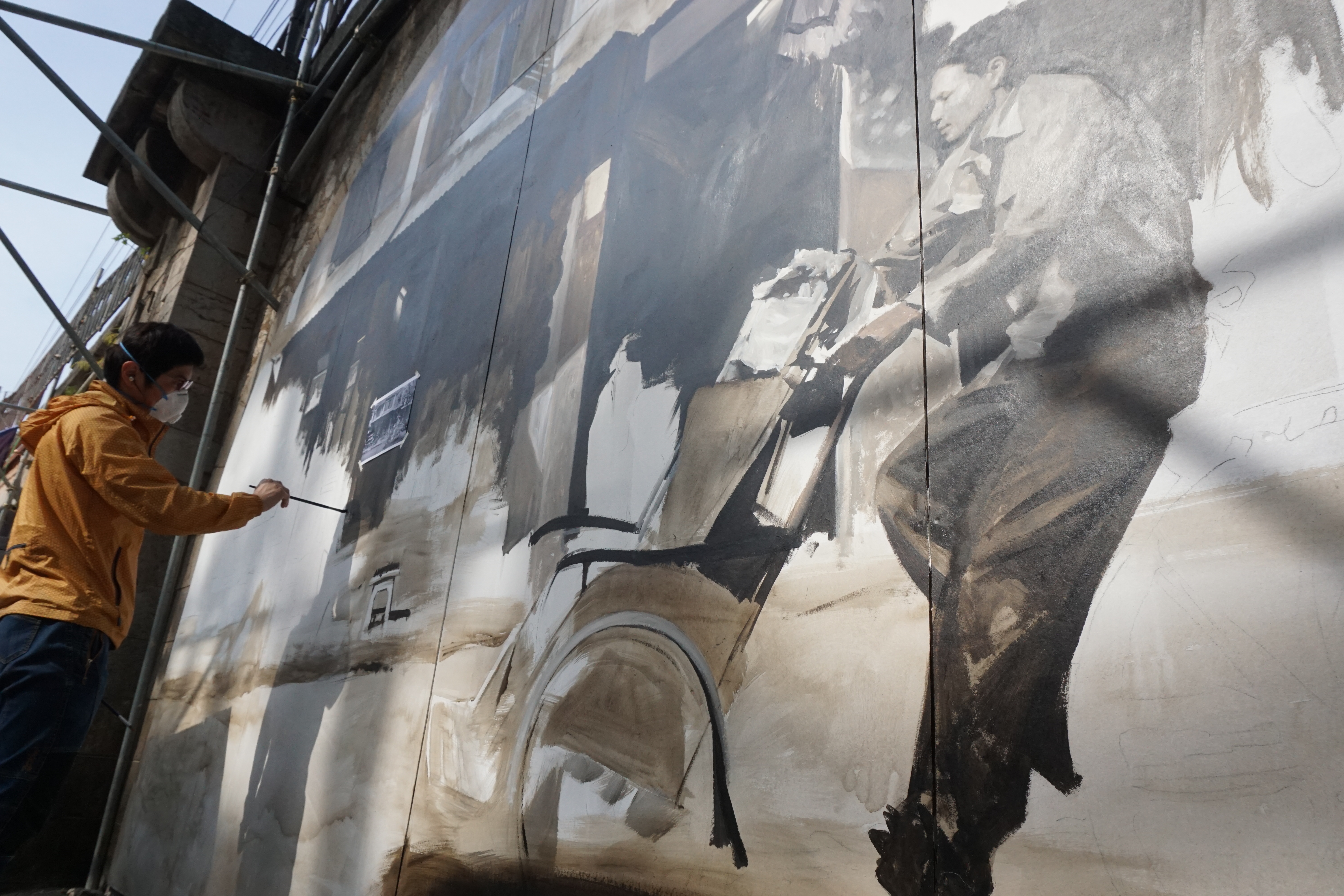 Ngày 3/11, tại phố Phùng Hưng, quận Hoàn Kiếm, Hà Nội, nhóm nghệ sĩ Hàn Quốc thực hiện những nét vẽ đầu tiên trong dự án “Bích họa trên phố Phùng Hưng”. Ảnh: Sáng 4/11, nhiều nghệ sĩ Hàn Quốc chăm chút từng nét vẽ.