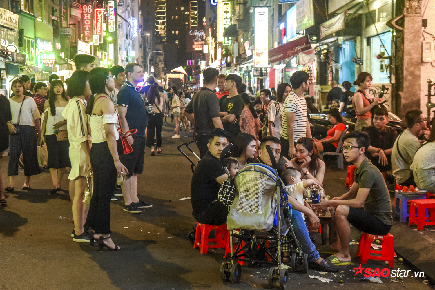 Theo ghi nhận của PV, vào 2 tối thứ Bảy và Chủ nhật cuối tuần, Bùi Viện dần trở nên đông đúc hơn, không lúc nào thiếu tiếng nhạc sàn chói tai. Từ lúc 7h tối đã có hàng nghìn lượt khách kéo về và tiệc tùng đến rạng sáng. Đặc biệt, sau 12h, khi lực lượng chức năng giảm bớt cũng là lúc nhiều cơ sở kinh doanh nhanh chóng dựng bàn, tràn ra lòng đường để bày bán bia rượu cho khách, thậm chí là cả bóng cười. Chỉ khi khi lực lượng chức năng rà soát, các chủ cơ sở lại nháo nhào lên dọn dẹp bàn ghế một lúc, sau đó lại bày biện đâu vào đấy, tiếp khách suốt đêm.