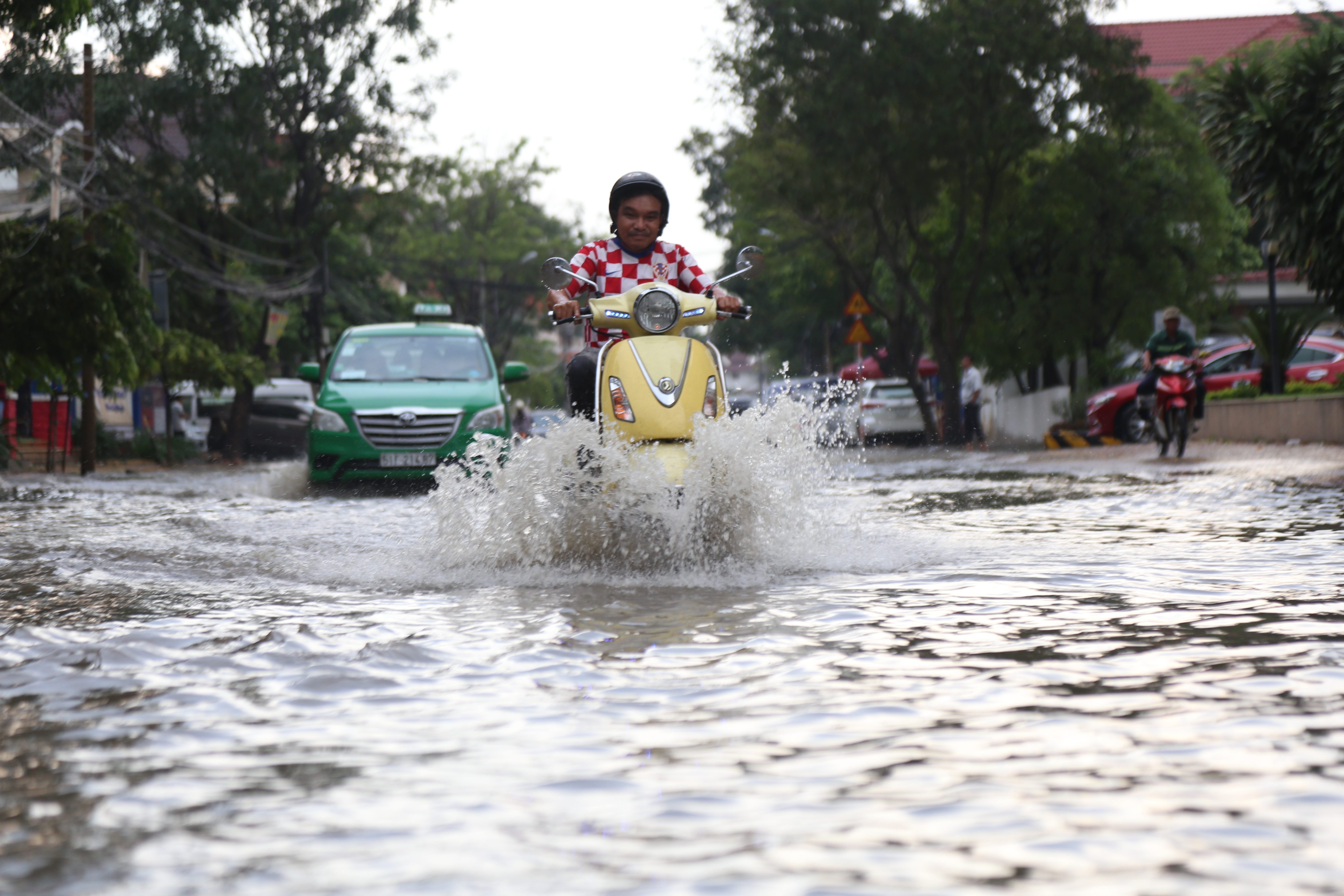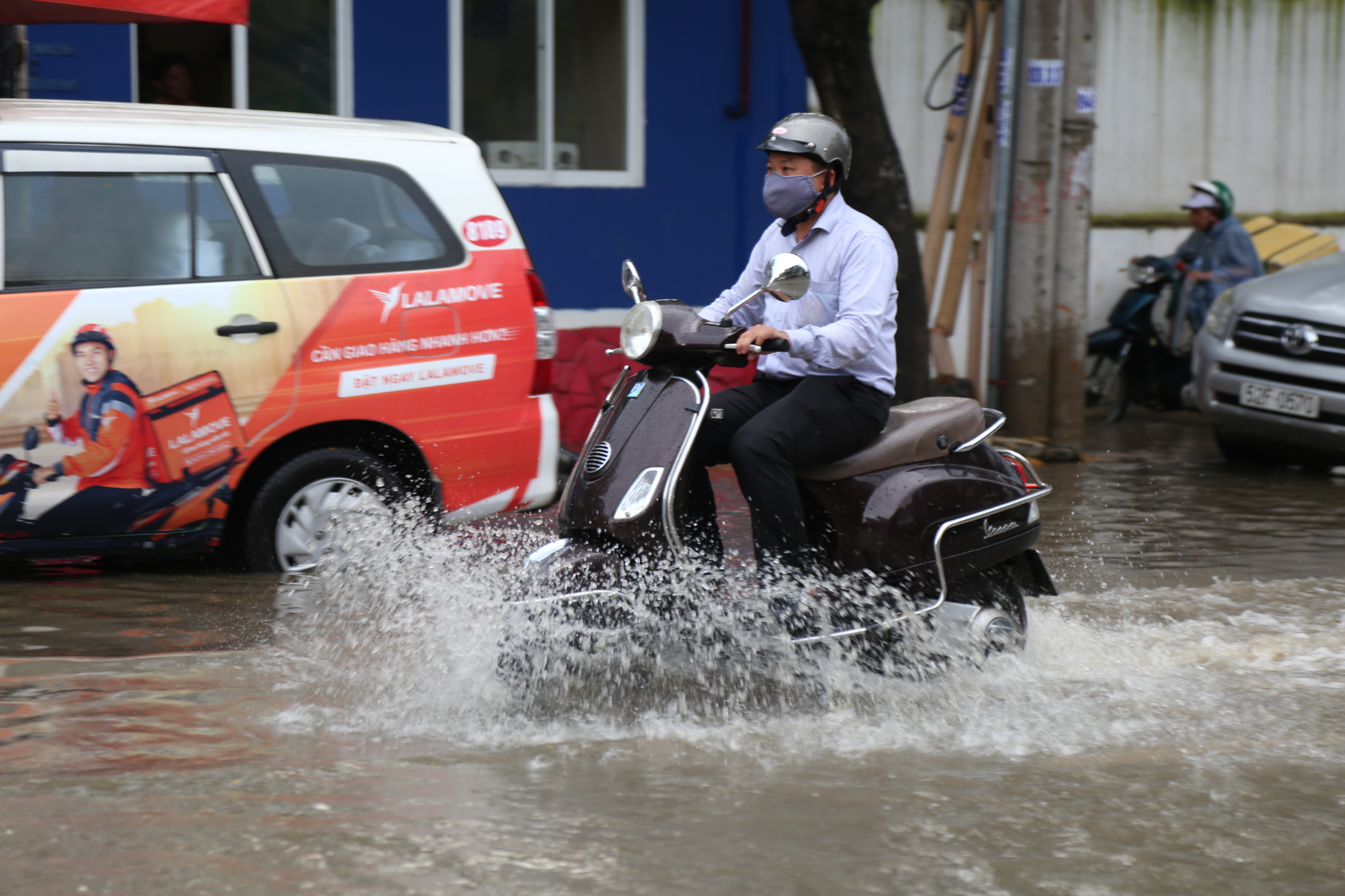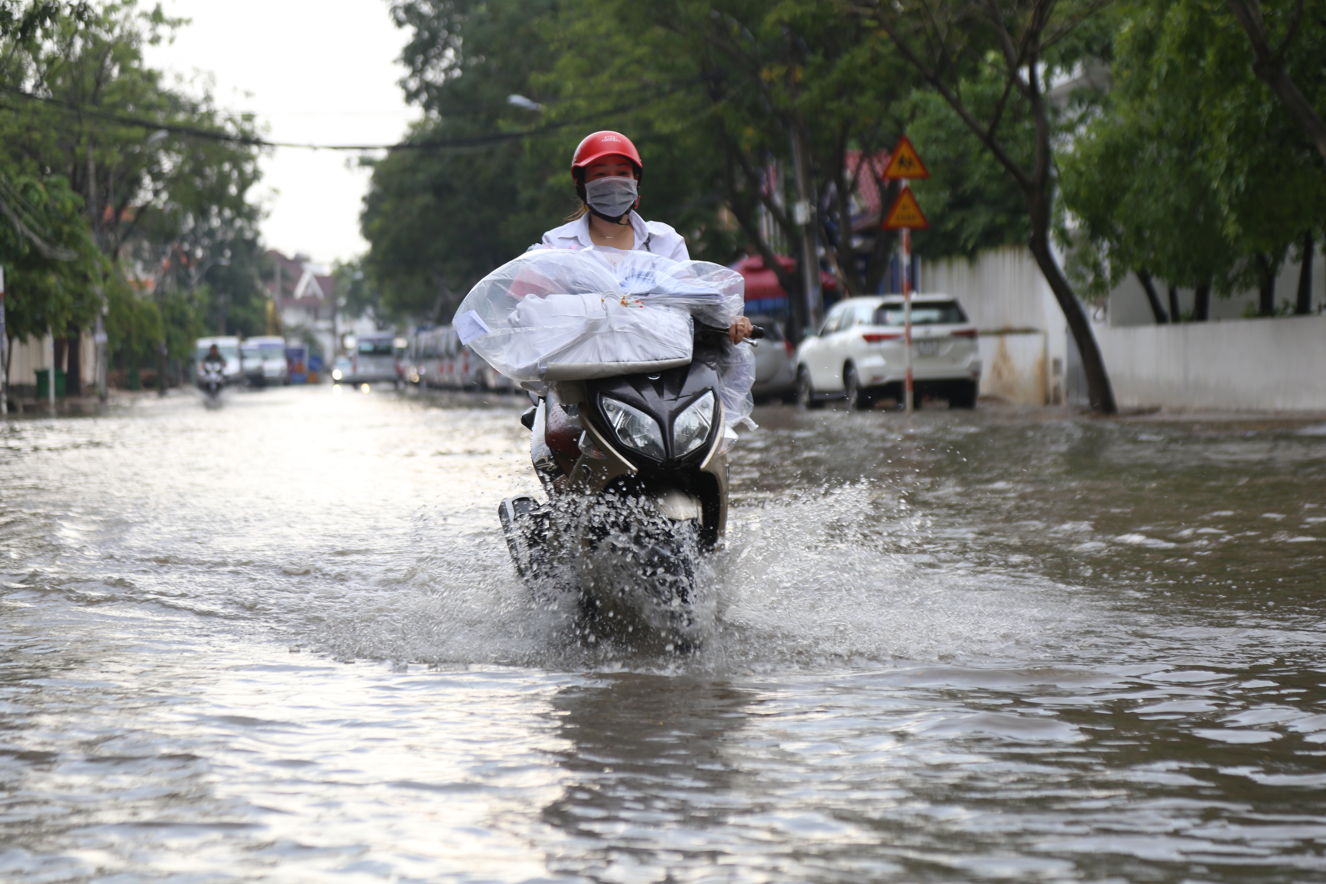 Mực nước dâng cao ngập nửa bánh xe máy khiến các phương tiện di chuyển khó khăn.