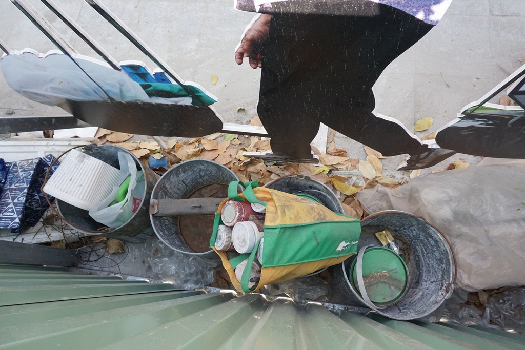 Những hộp sơn, thùng đựng bỏ không.