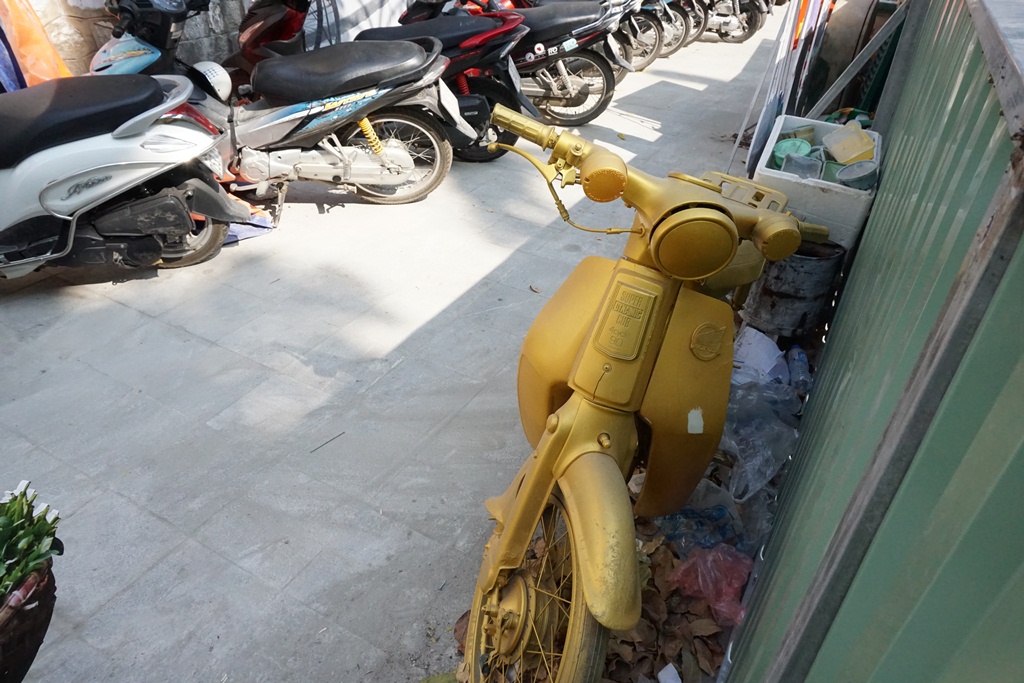 Cạnh chiếc xe máy cũ được sơn để trưng bày tại đây bị bụi phủ kín, bên dưới đầy lá rụng, rác vứt bừa bãi.