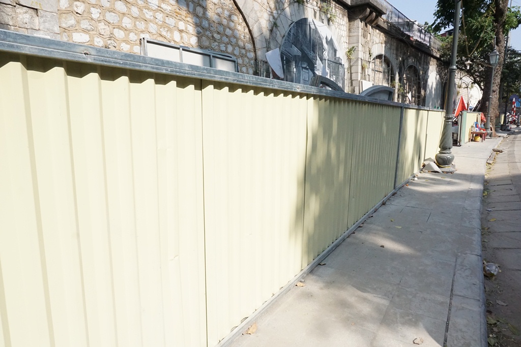 Dọc khu vực này được quây tường tôn, kèo cột phục vụ dự án nằm chờ các bước triển khai tiếp theo.
