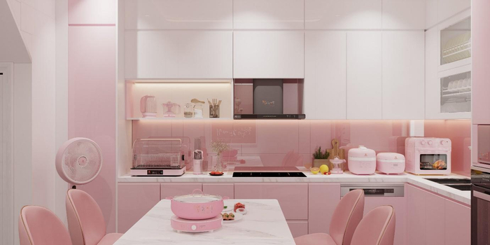 Gian bếp màu hồng sẽ trở thành điểm sáng của cả căn nhà. Sự phối màu đỉnh cao này thể hiện rằng chủ nhân cực kỳ có “gout”. Người mua còn có thể ứng dụng sản phẩm như một phụ kiện bắt mắt. “Cơn lốc màu hồng” quét qua thị trường gia dụng thời trang, tạo nên một làn sóng mới về phong cách sống thơ mộng.