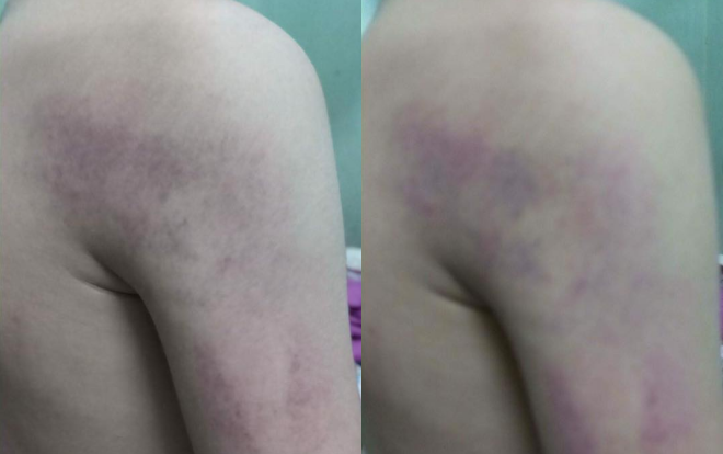“Chiều 2/5, lúc cháu đi học về thì chồng tôi tắm cho con nhìn thấy các vết thâm tím khắp người nên hỏi. Mới đầu cháu nói bị muỗi đốt, nhưng sau khi bố cháu gặng hỏi, cháu cho biết bị cô giáo dùng thước kẻ đánh”, chị V. nói.