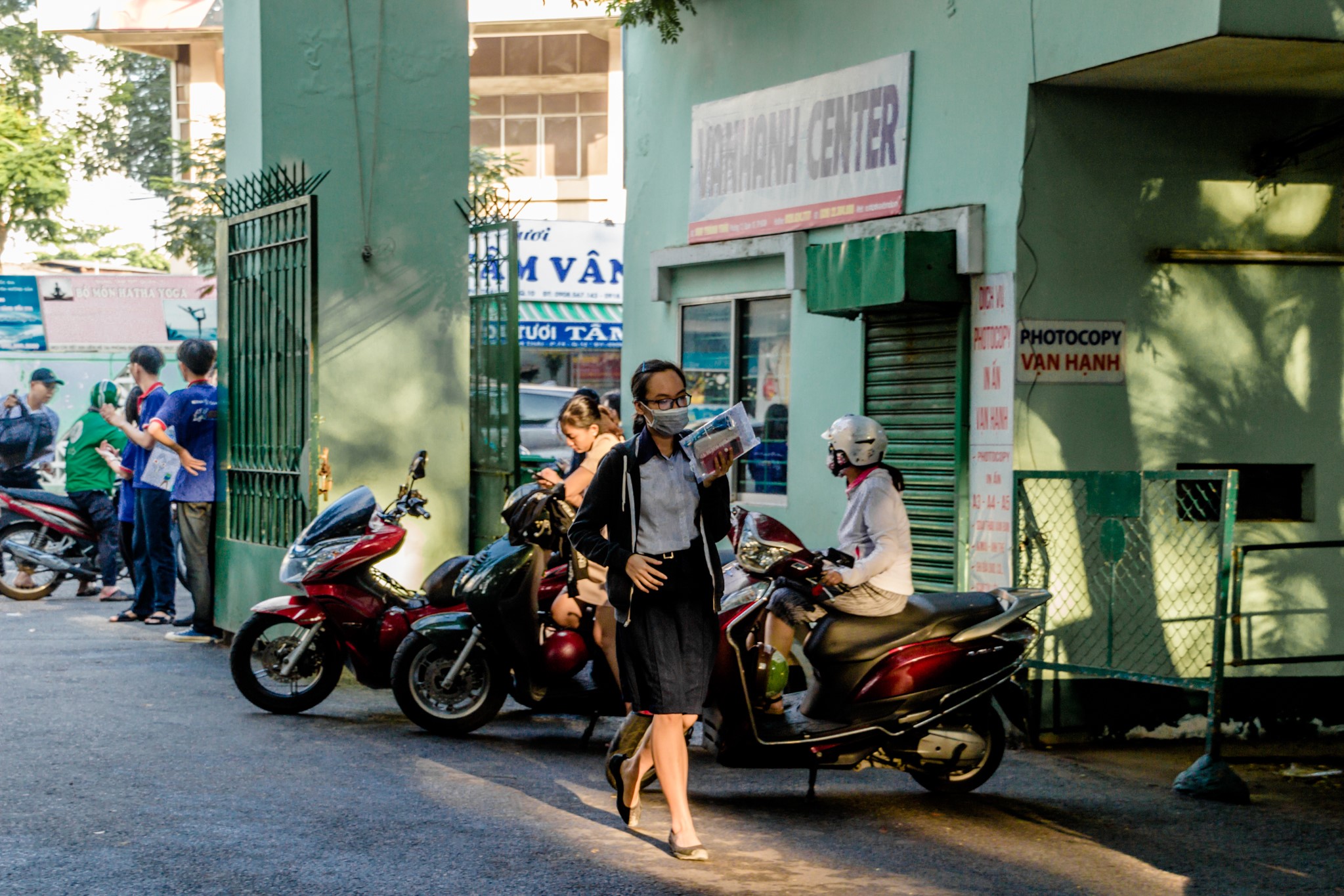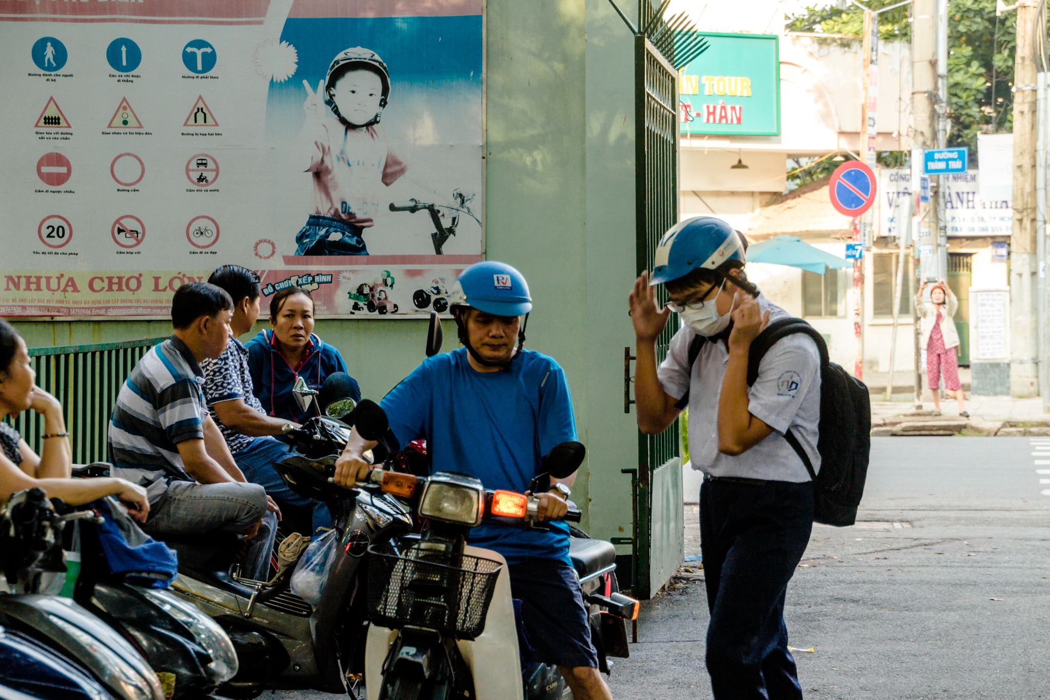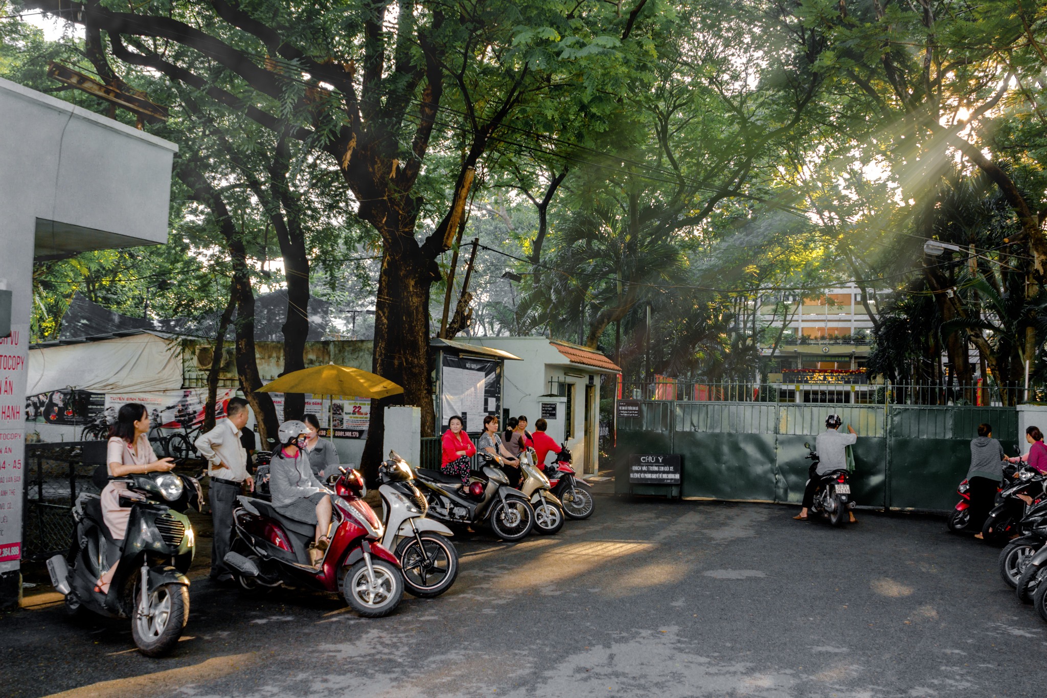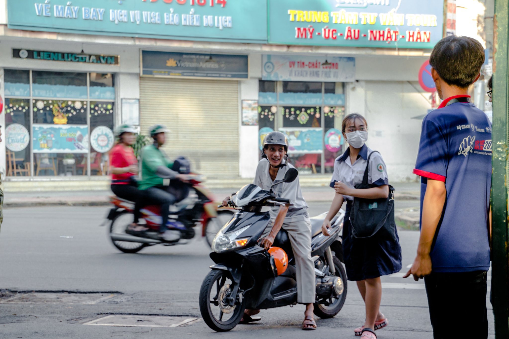 Các phụ huynh đưa con em đến trường bằng xe máy.