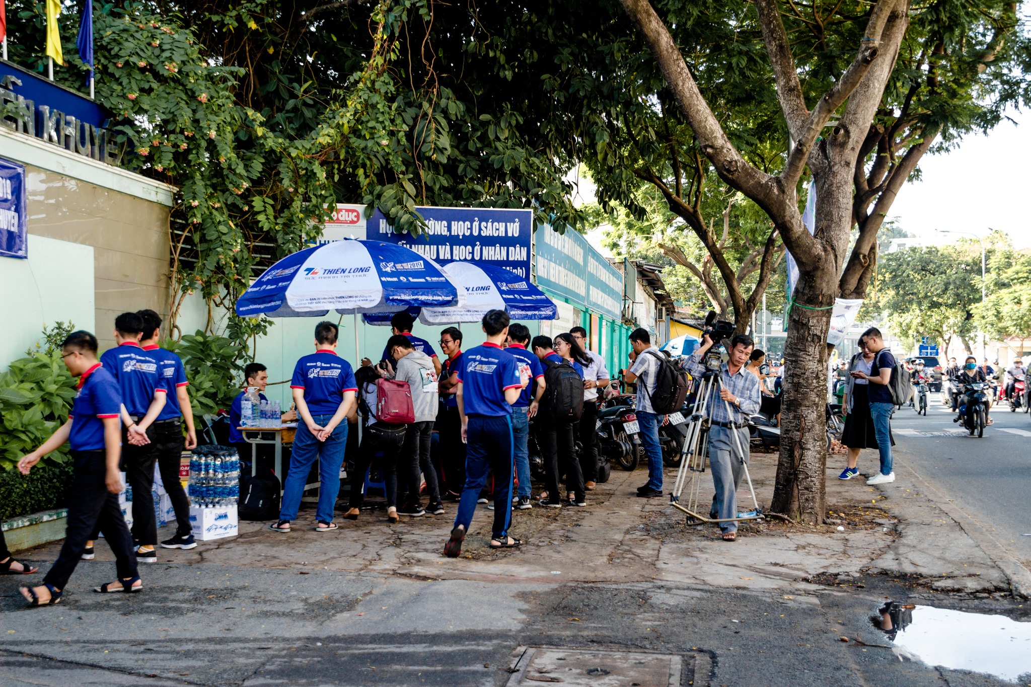 Khu vực bên ngoài, đội sinh viên tình nguyện vẫn túc trực để hỗ trợ thí sinh và phụ huynh.