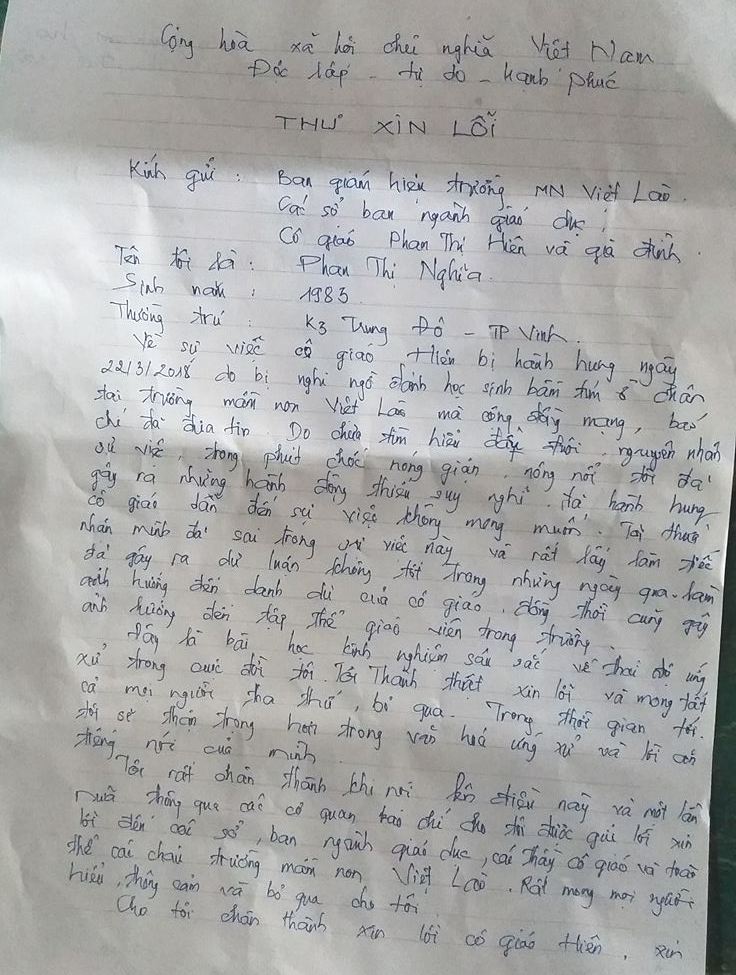 “Tôi nhận mình đã sai trong việc này và rất lấy làm tiếc đã gây ra dư luận không tốt trong những ngày qua, làm ảnh hưởng đến danh dự của cô giáo, đồng thời cũng gây ảnh hưởng đến tập thể giáo viên trong trường”, bà Nghĩa nói.