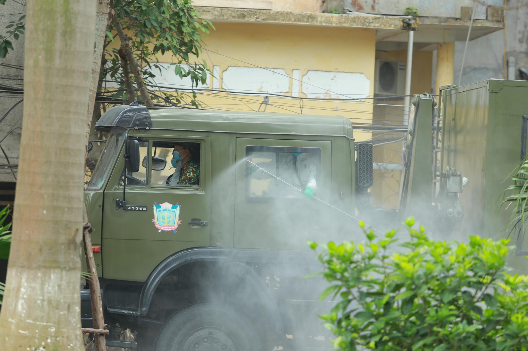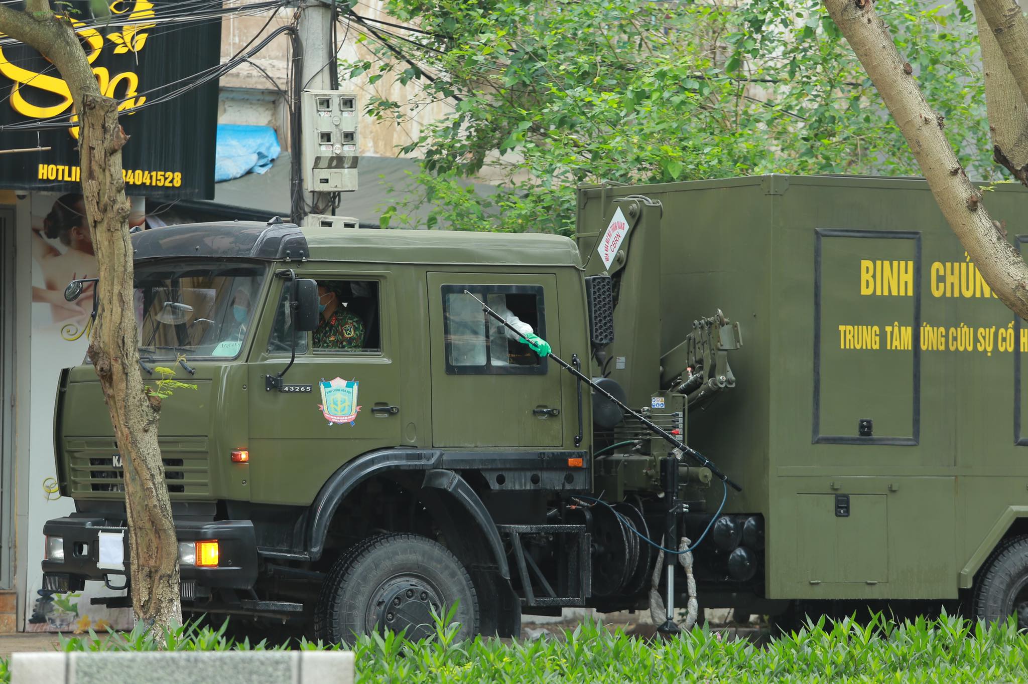 Xe chuyên dụng của Binh chủng hóa học đi dọc phố Trúc Bạch để phun thuốc.