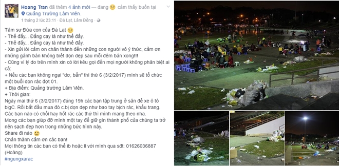 Không dừng lại ở việc đứng nhìn và lên án, bạn Trần Minh Hoàng (sinh năm 1997, sinh sống tại Đà Lạt) đã kêu gọi những bạn trẻ yêu địa phương nói riêng và những người yêu du lịch nói chung cùng chung tay dọn sạch quảng trường thành phố.