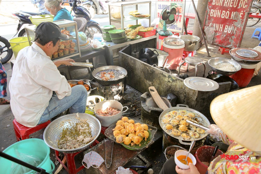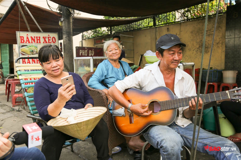 Khi mà âm thanh ồn ào của khu chợ, tiếng lách tách của bếp lửa và tiếng lèo xèo của chảo chiên bánh được hòa chung với tình khúc nhạc Trịnh, Ngô Thụy Miên, Trần Thiện Thanh… trong phút chốc khách hàng ngỡ như mình đang ngồi trong một phòng trà thay vì một hàng quán vỉa hè.