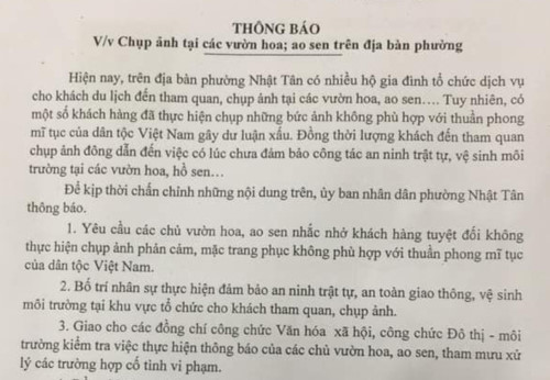 Theo thông báo, hiện trên địa bàn phường Nhật Tân có nhiều hộ gia đình tổ chức dịch vụ cho khách du lịch đến tham quan, chụp ảnh tại các vườn hoa, ao sen… Tuy nhiên, một số khách hàng đã chụp những bức ảnh “không phù hợp với thuần phong mỹ tục của người Việt Nam, gây dư luận xấu”.