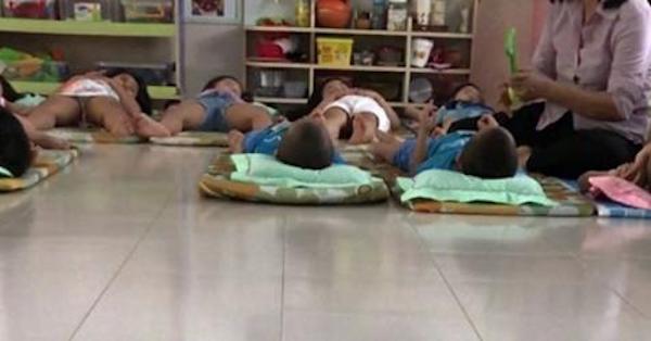 Ngoài ra, một clip khác tiếp tục ghi lại cảnh học sinh nằm ngủ dưới nền nhà lớp học. Đang nằm ngủ chung với học sinh, cô giáo Ngọc vùng dậy, xông đến đánh, cào vào người đứa trẻ rồi ra lệnh: “Nhắm mắt!”. Khi cháu học sinh mếu máo chuẩn bị khoác, cô giáo Ngọc lớn tiếng dọa nạt: “Ngậm cái miệng lại nha..”. Thấy đứa trẻ nằm im, cô giáo Ngọc quay sang lấy tay chỉ mặt một bé khác rồi thoải mái nằm xuống sàn nhà nghỉ ngơi.