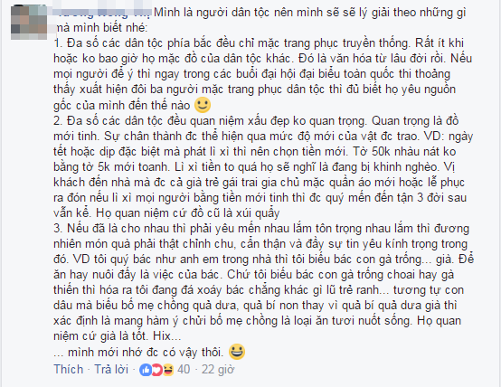 Trước những lời chỉ trích “chảnh”, “nghèo còn sĩ diện” từ câu chuyện trên, một số cư dân mạng tự nhận là đồng bào dân tộc đã đưa ra lời giải thích rằng: Tấm lòng của người dân khắp mọi miền đất nước đều được đồng bào nơi đây trân trọng, thế nhưng “thiện ý” này không được nhiệt tình đáp lại cũng bởi lí do xuất phát từ phong tục tập quán:
