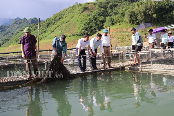 Ông Nguyễn Văn Tâm, Trưởng phòng Nông nghiệp Phát triển nông thôn huyện Mường La (đầu tiên từ trái sang) cho biết: Thời gian qua, nhiều hộ đã có của ăn của để và thu nhập hàng trăm triệu nhờ mô hình nuôi cá lồng.