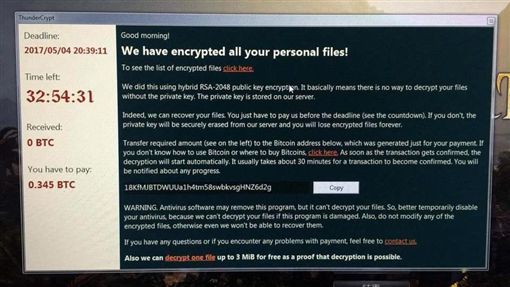 Ngày 4 tháng 5 vừa qua, mã độc ThunderCrypt đã tấn công vào nhiều máy tính tại Đài Loan (Trung Quốc) và yêu cầu số tiền chuộc 0,345 Bitcoin (gần 600 USD) để lấy lại dữ liệu. Tuy nhiên một nạn nhân của ThunderCrypt không đủ khả năng để trả số tiền này.