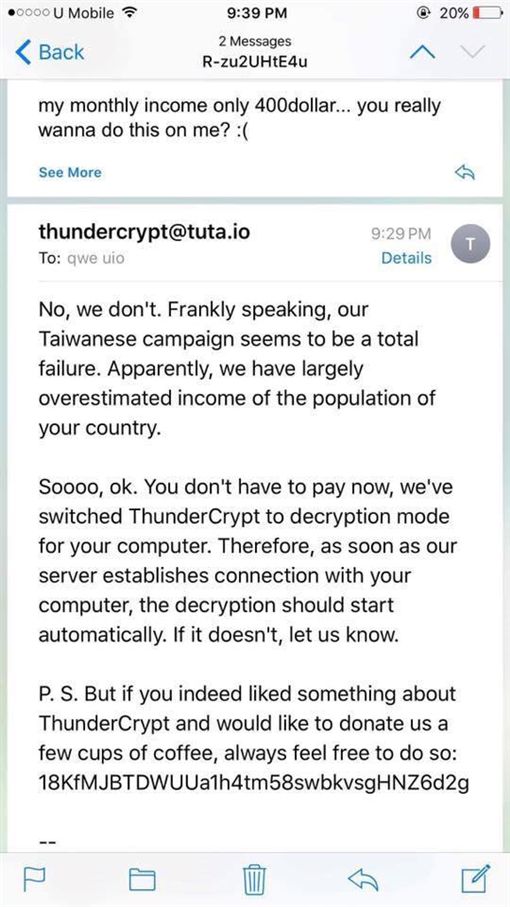 Anh chàng này đã quyết định gửi email tới địa chỉ liên lạc mà ThunderCrypt để lại và nói rằng anh ta chỉ kiếm được 400 USD mỗi tháng. Phải trừ đi rất nhiều chi phí sinh hoạt nên anh ta không đủ khả năng trả số tiền chuộc 0,345 Bitcoin mà ThunderCrypt yêu cầu.
