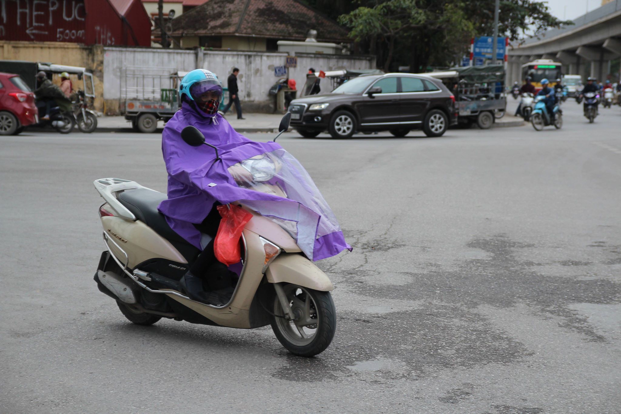Tại Hà Nội từ đêm 8-14/01 trời rét đậm, có nơi rét hại với nhiệt độ thấp nhất phổ biến từ 10-12 độ. Dù trời không mưa nhưng nhiều người vẫn mặc áo mưa để vơi bớt giá rét.