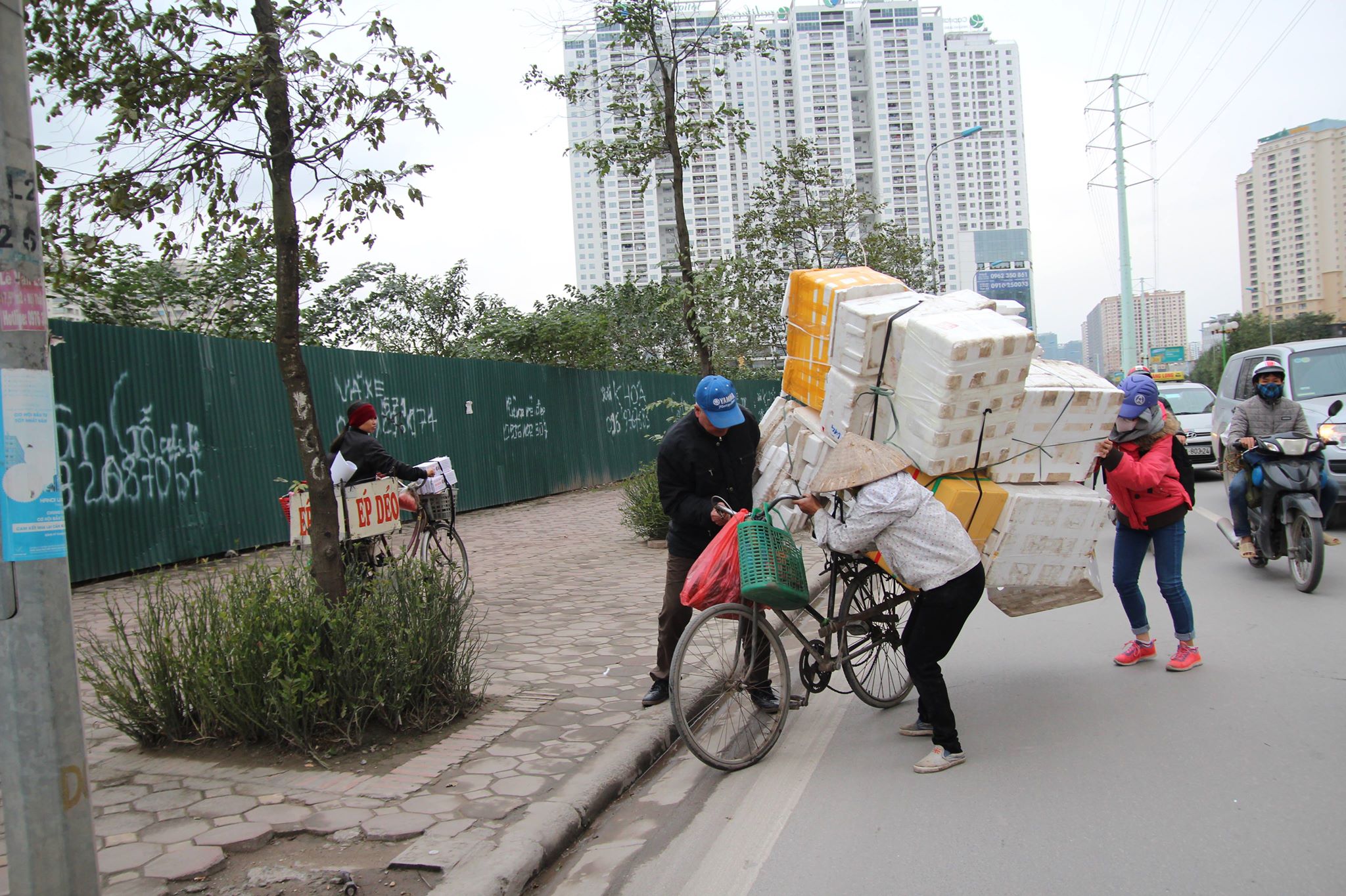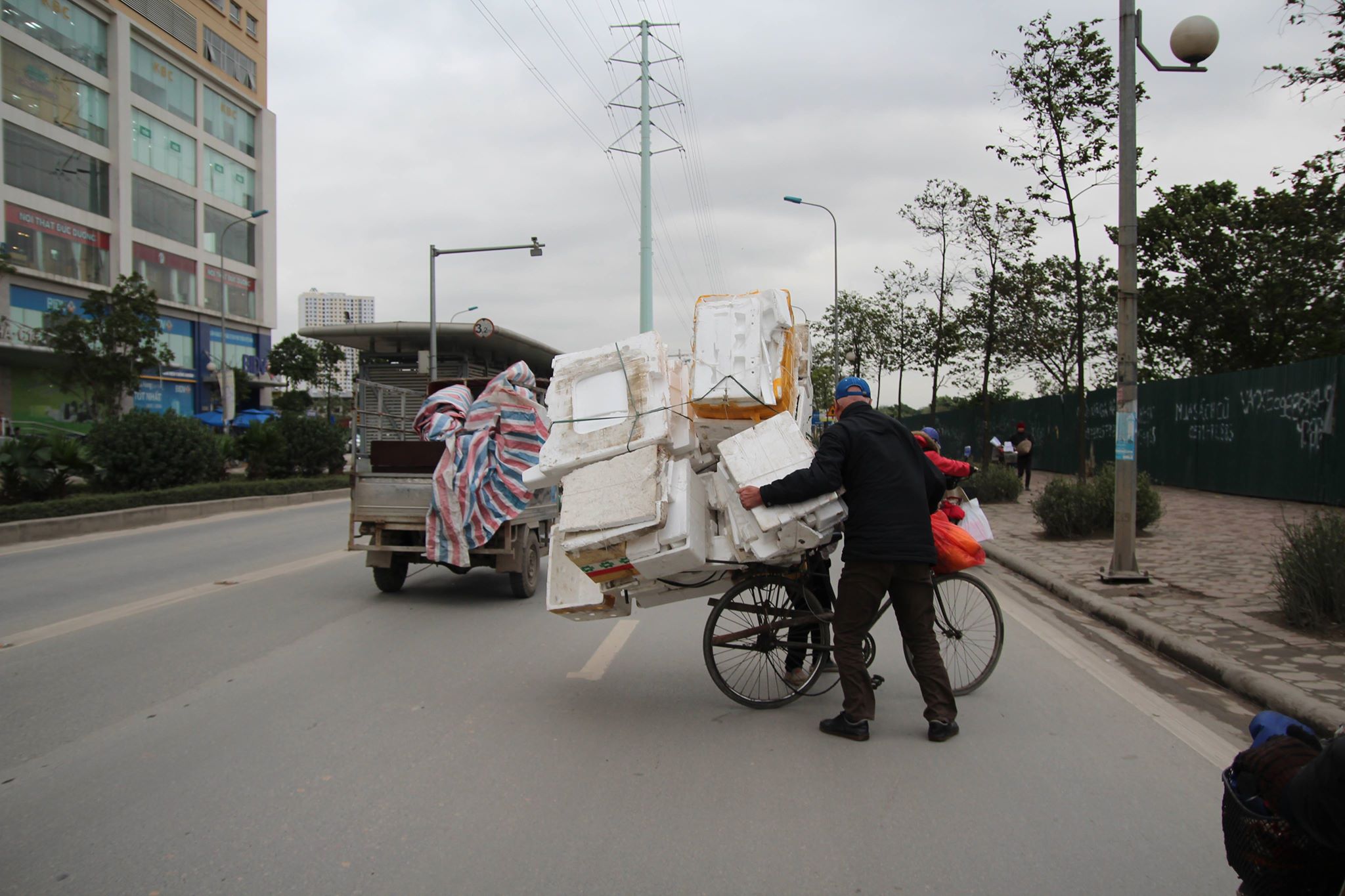 Một người nhặt phế liệu chở hàng cồng kềnh được một số người đi đường giúp sức sau khi bị gió quật đổ.