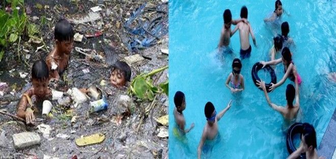 Thay vì được vui chơi tại hồ bơi thì những trẻ em nghèo đang “lặn ngụp” giữa dòng sông đầy rác vì mưu sinh