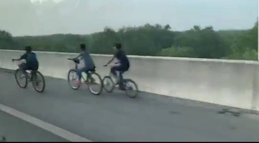 3 thiếu niên đạp xe đạp trên cao tốc.