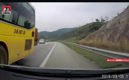 Theo đó, hình ảnh từ camera hành trình của một ô tô cho thấy, ngày 6/3, xe khách BKS: 24B - 00729, của nhà xe Hà Sơn Hải Vân, đang chạy với tốc độ cao, sau đó lấn làn để vượt mặt xe container đang chạy cùng chiều, phía trước.