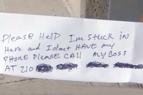 Do để quên điện thoại trên xe, anh này không biết làm cách nào để kêu cứu với người bên ngoài. Cuối cùng, anh dùng cách ghi lời kêu cứu trên biên lai rồi trượt thông điệp qua khe rút tiền hòng có người nào đó có thể giúp anh ra ngoài. “Làm ơn giúp, tôi bị kẹt trong này và không mang theo điện thoại, vui lòng gọi cho sếp của tôi với số máy này“, anh viết.