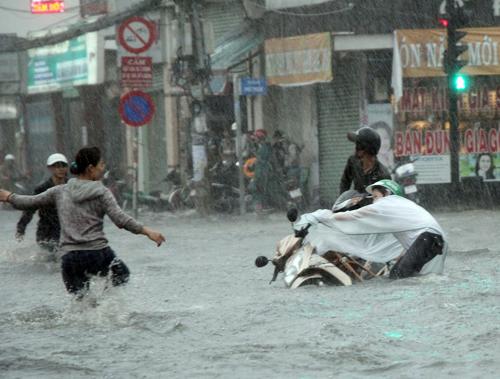 Nước ngập sâu ở một số con đường khiến người tham gia giao thông bị ngã. Ảnh: Phạm Duy