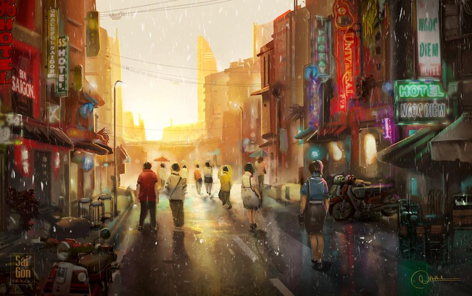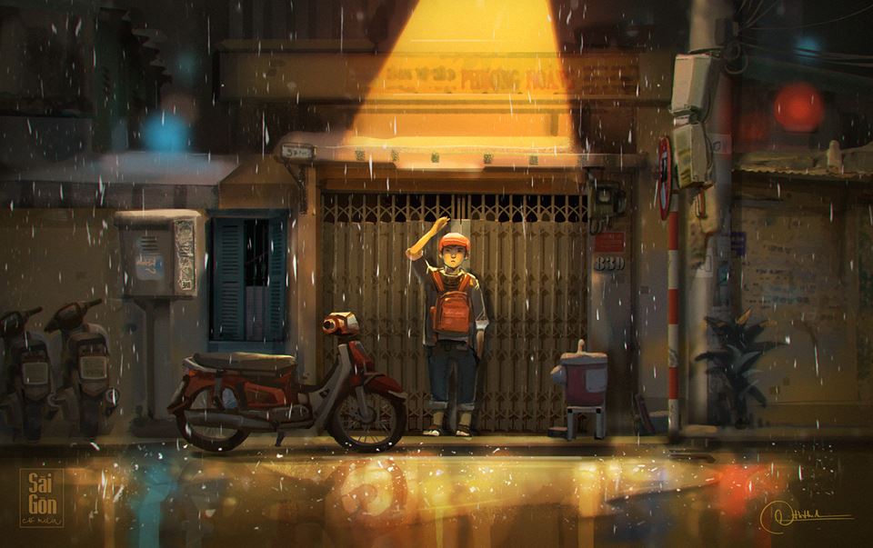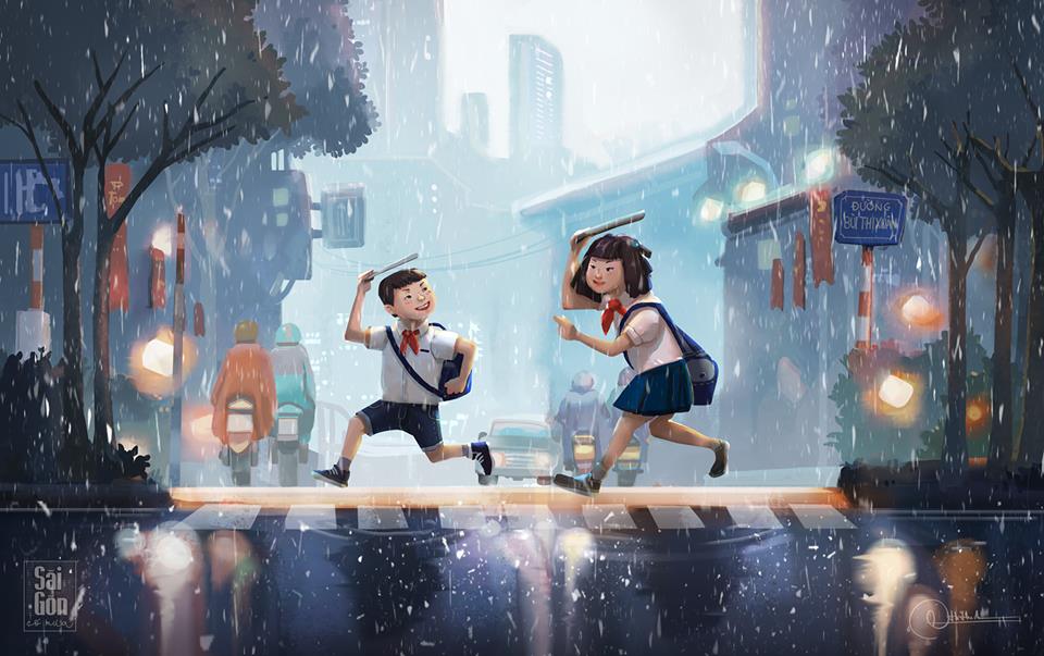 Hà Nội hay Sài Gòn đều hối hả và vội vã với guồng quay của cuộc sống. Đó đúng ra là cuộc đua với thời gian. Thế nhưng ở đâu đó trong góc ngách nhỏ là những khoảnh khắc nhẹ nhàng, tinh khôi khiến ai nhìn thấy cũng vô thức mỉm cười. Dường như những công việc bộn bề, âu lo phiền muộn, mối bận tâm thường ngày đều được chôn cất nơi nào đó để lại một Sài Gòn thanh thản dưới những cơn mưa.