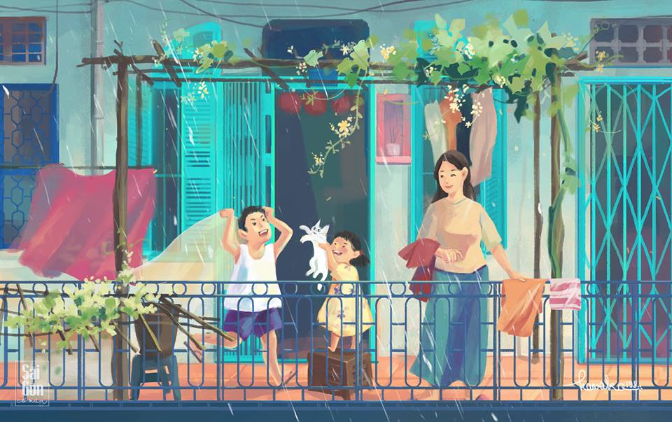 Là những lúc vừa nghe tiếng mưa rơi trên mái nhà đã vội vã lấy đồ phơi ở ban công cùng mẹ.