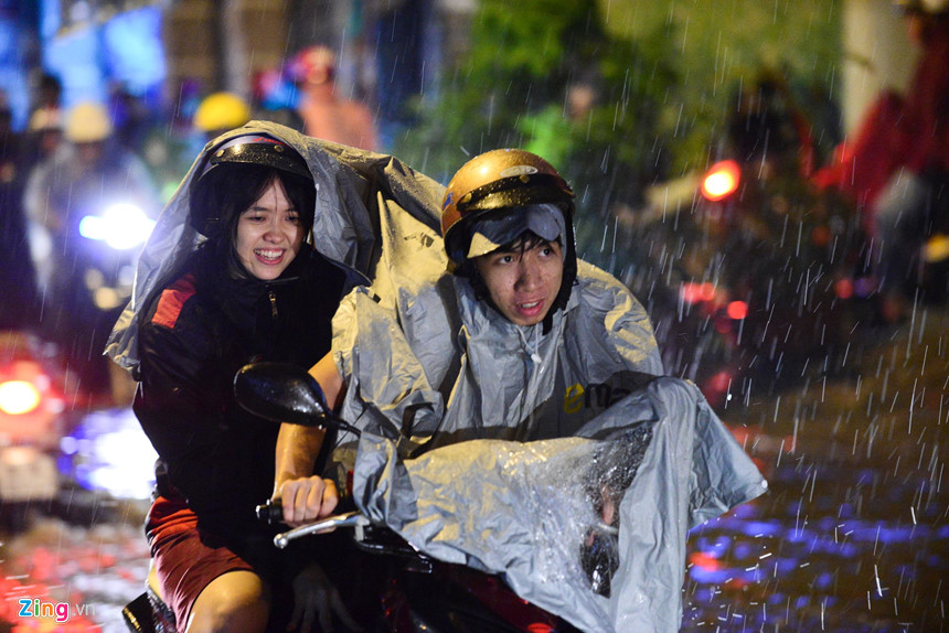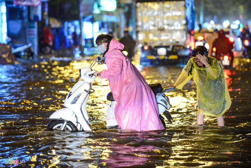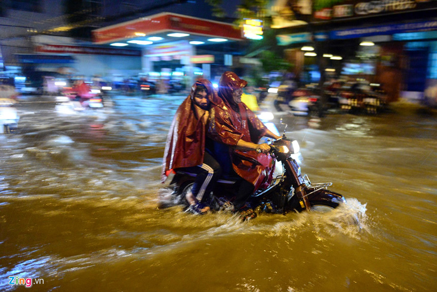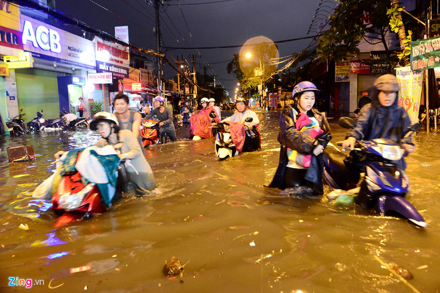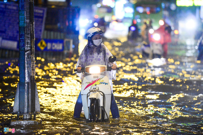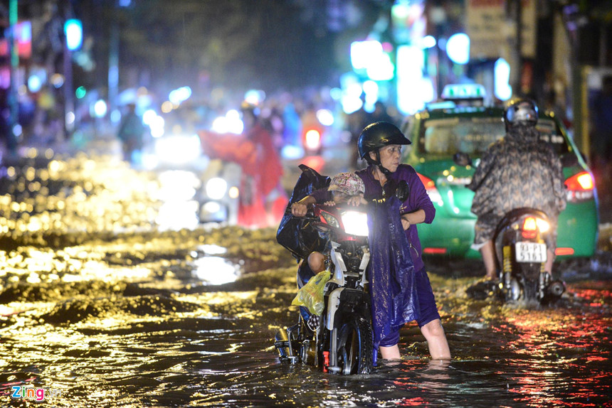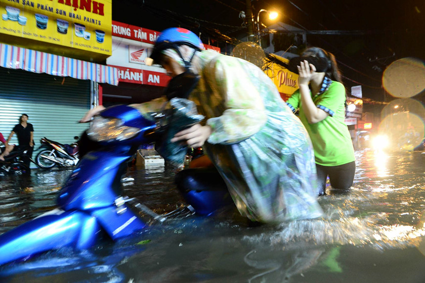 Nước ngập lênh láng khiến nhiều xe cộ chết máy, người dân lội bì bõm, vất vả về nhà. Mưa kèm theo dông sét dữ dội còn khiến người sợ hãi. Trong hình, chàng trai dắt xe đưa bạn gái qua đường ngập Nguyễn Xí, quận Bình Thạnh. Ảnh: Tùng Tin.