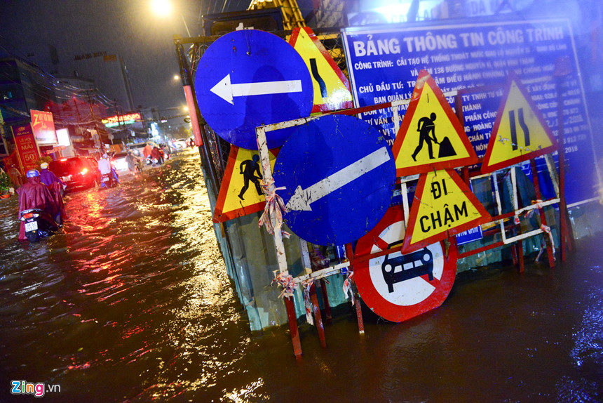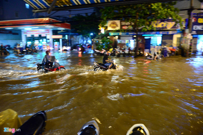 Tối 19/5, cơn mưa lớn đổ xuống các quận 1, 2, 3, 5, 7, 8, 10, 12, quận Bình Thạnh, Tân Bình, Gò Vấp… khiến nhiều tuyến đường không kịp thoát nước bị ngập nặng. Ảnh: Tùng Tin.