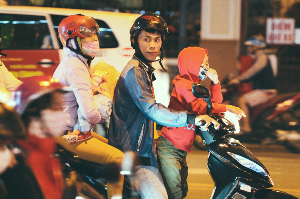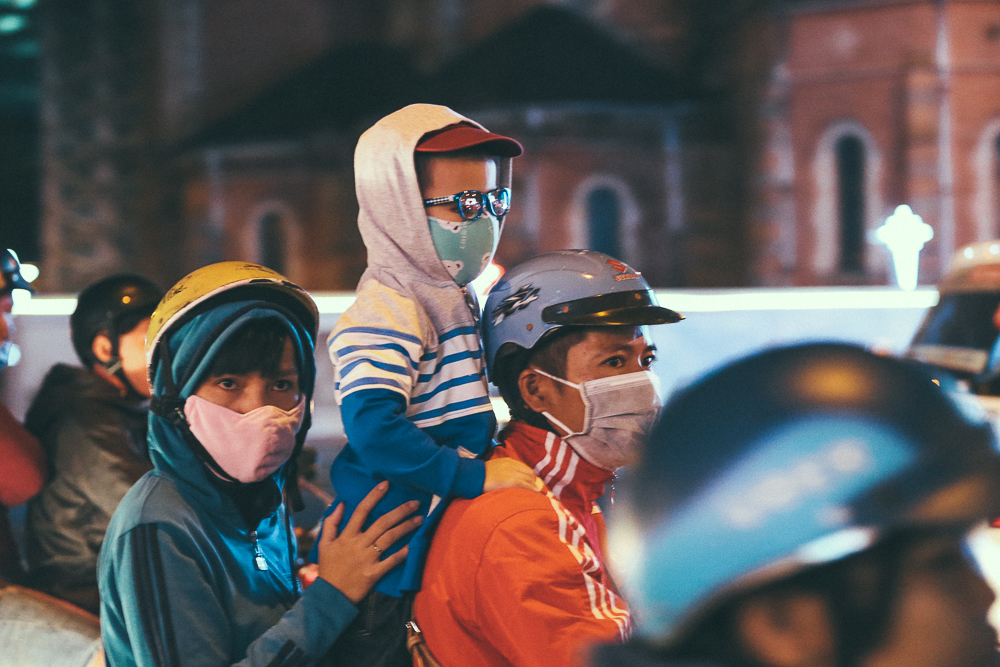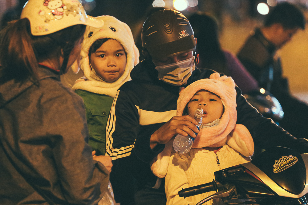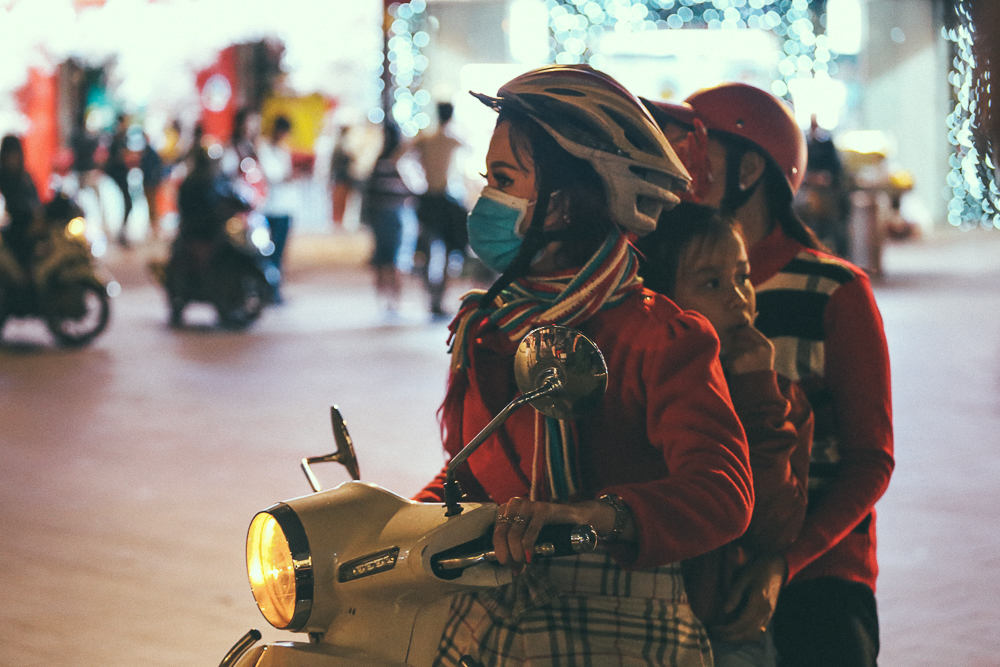 Càng về đêm, nhiệt độ ở Sài Gòn xuống thấp khiến người dân ra đường vui chơi dịp Giáng sinh phải co ro trong cái lạnh.